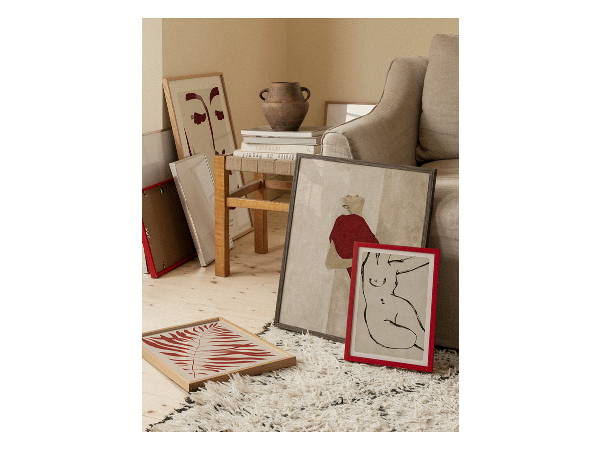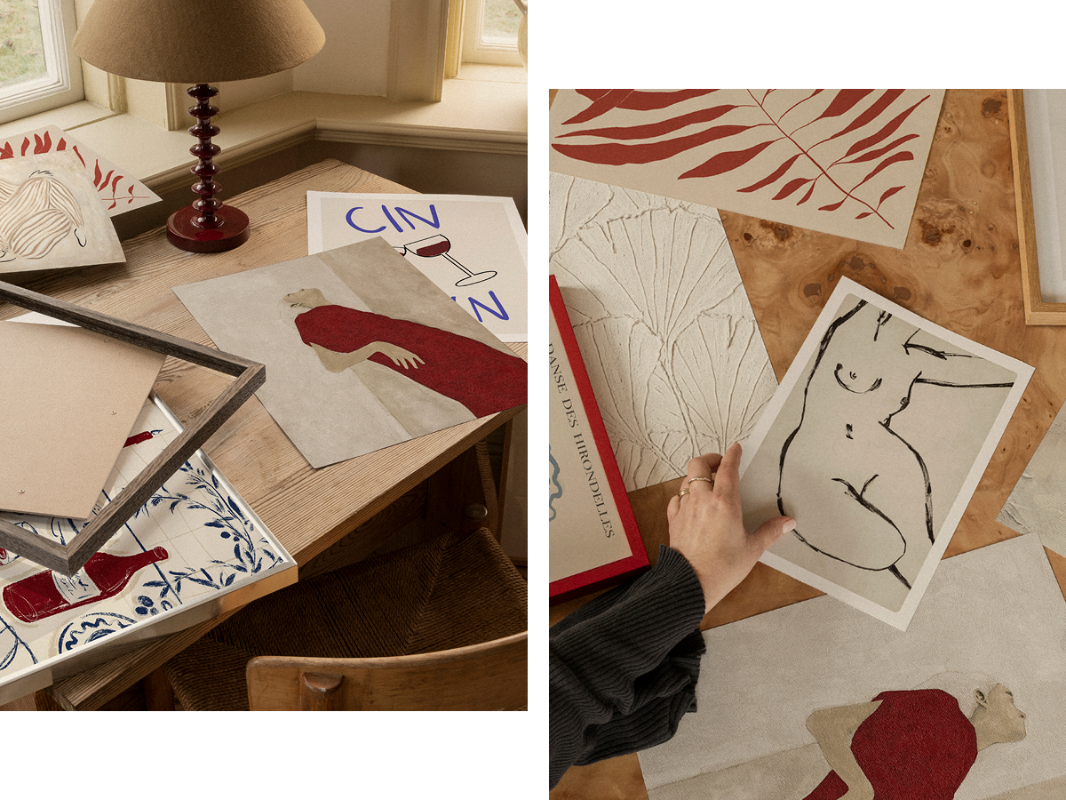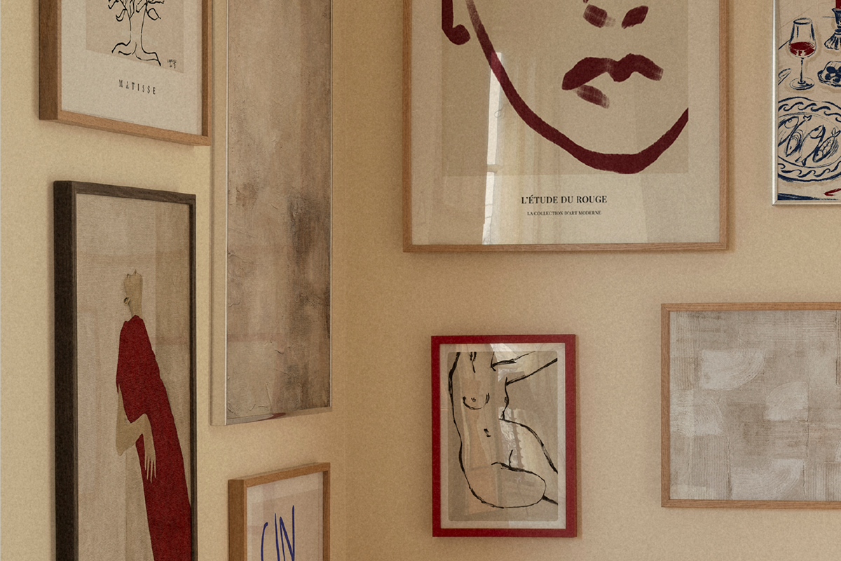 Try to find something that connects the designs, it can be a colour, a style or a feeling. Designs that complement each other create harmony and make the whole gallery wall feel more more considered.