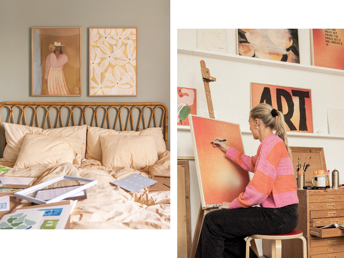 Para empezar, Elsa Karlsson, que es Diseñadora de Obras de Arte en Desenio, compartió su espacio con nosotros. Manteniendo algunos de sus cuadros personales pero colgándolos junto con piezas nuevas de Desenio Seasonal Editions, renovamos su espacio para la primavera y creamos una sensación más animada y dinámica en el hogar.