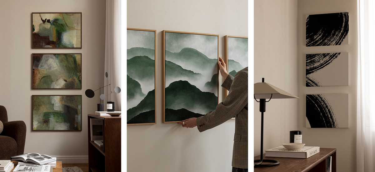 Un trío de cuadros es más que decoración; es la pieza protagonista que une tu habitación. Tómate un momento para pensar en el ambiente que quieres crear y deja que tus cuadros actuales te guíen. Quizás haya uno o dos colores esperando a repetirse en tu nuevo conjunto.