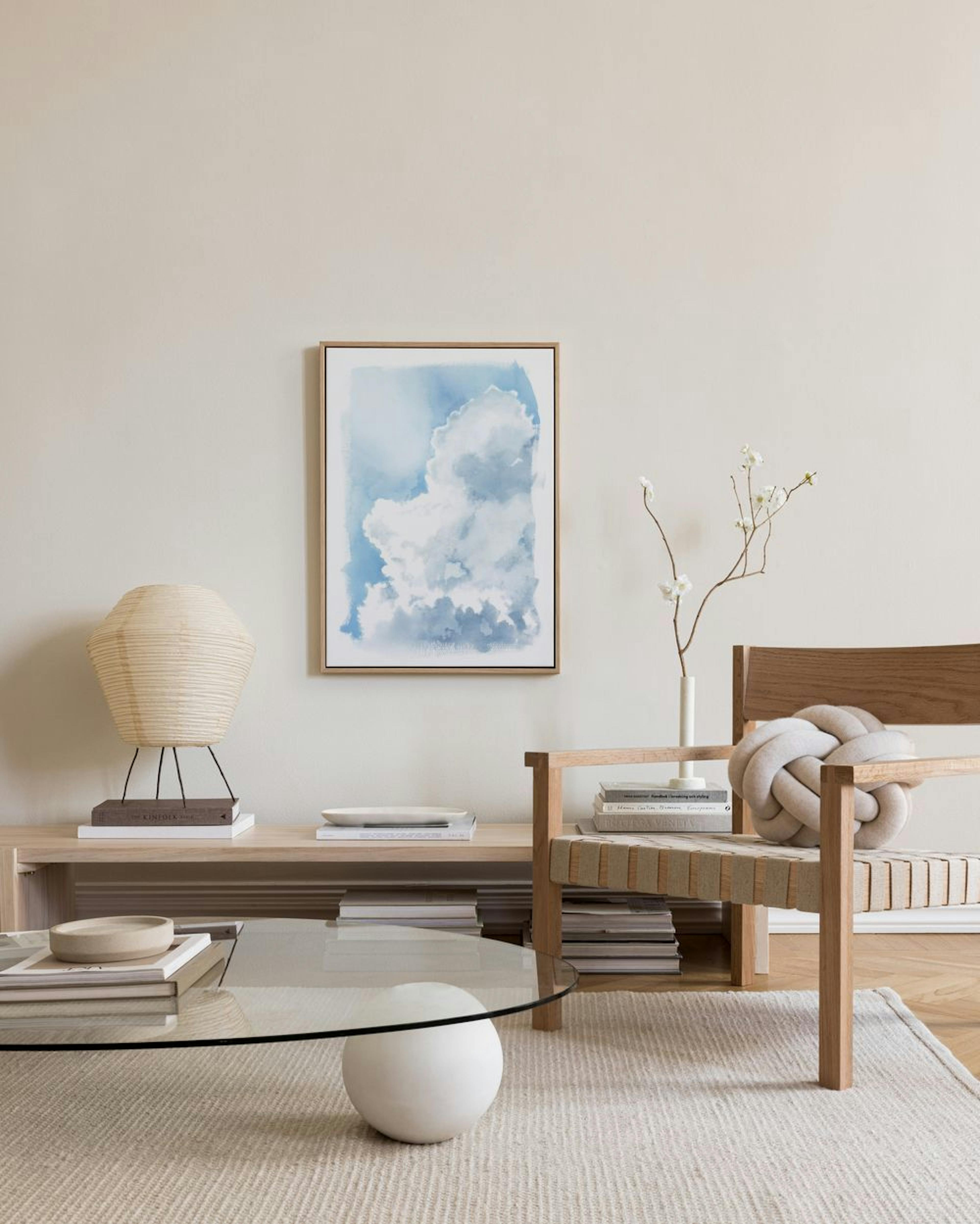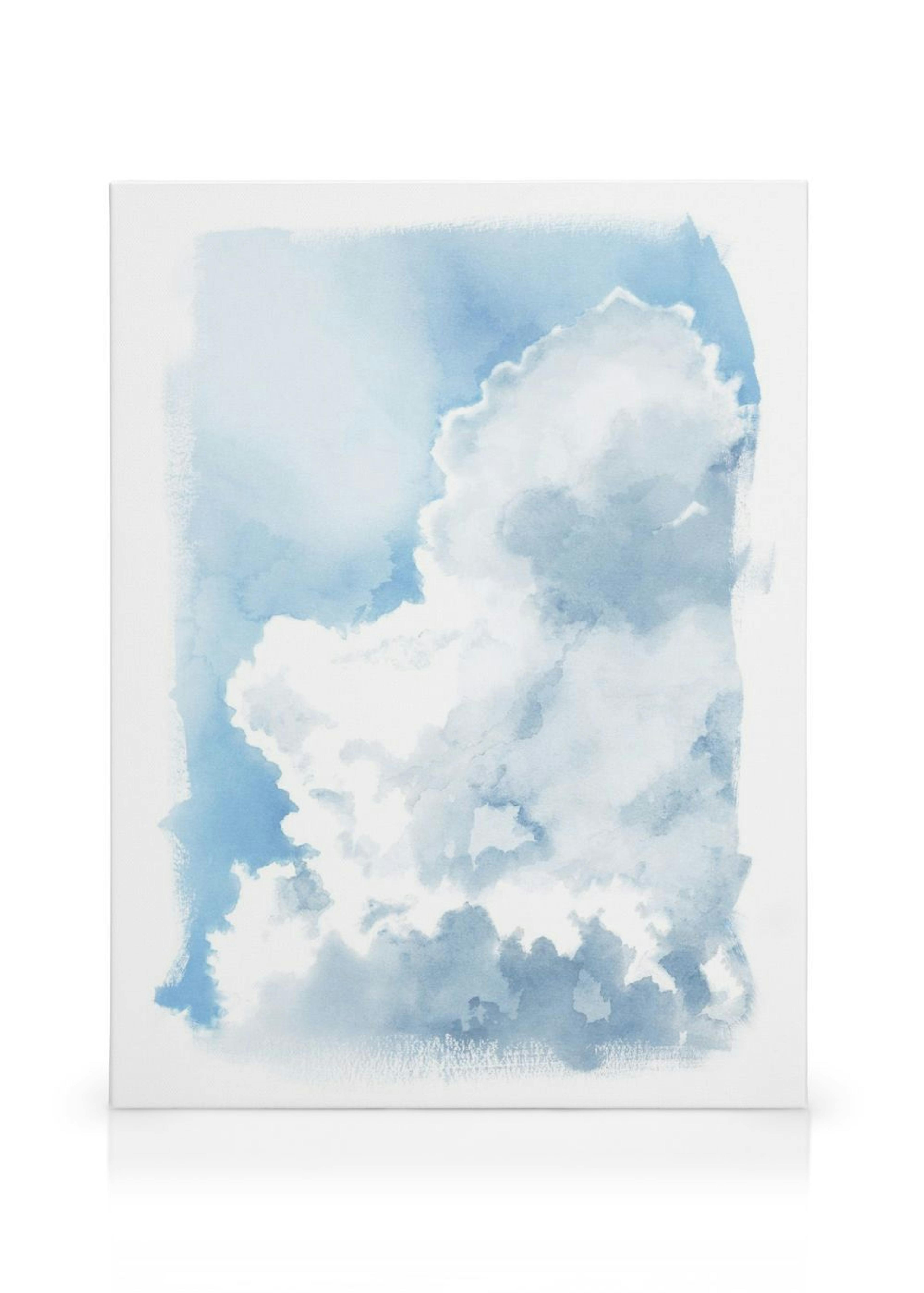 Este lienzo atmosférico representa un cielo de nubes blancas suaves y esponjosas contra tonos de azul, creando una hermosa sensación de profundidad. Perfecto como arte de pared para su galería de murales de cuadros.
