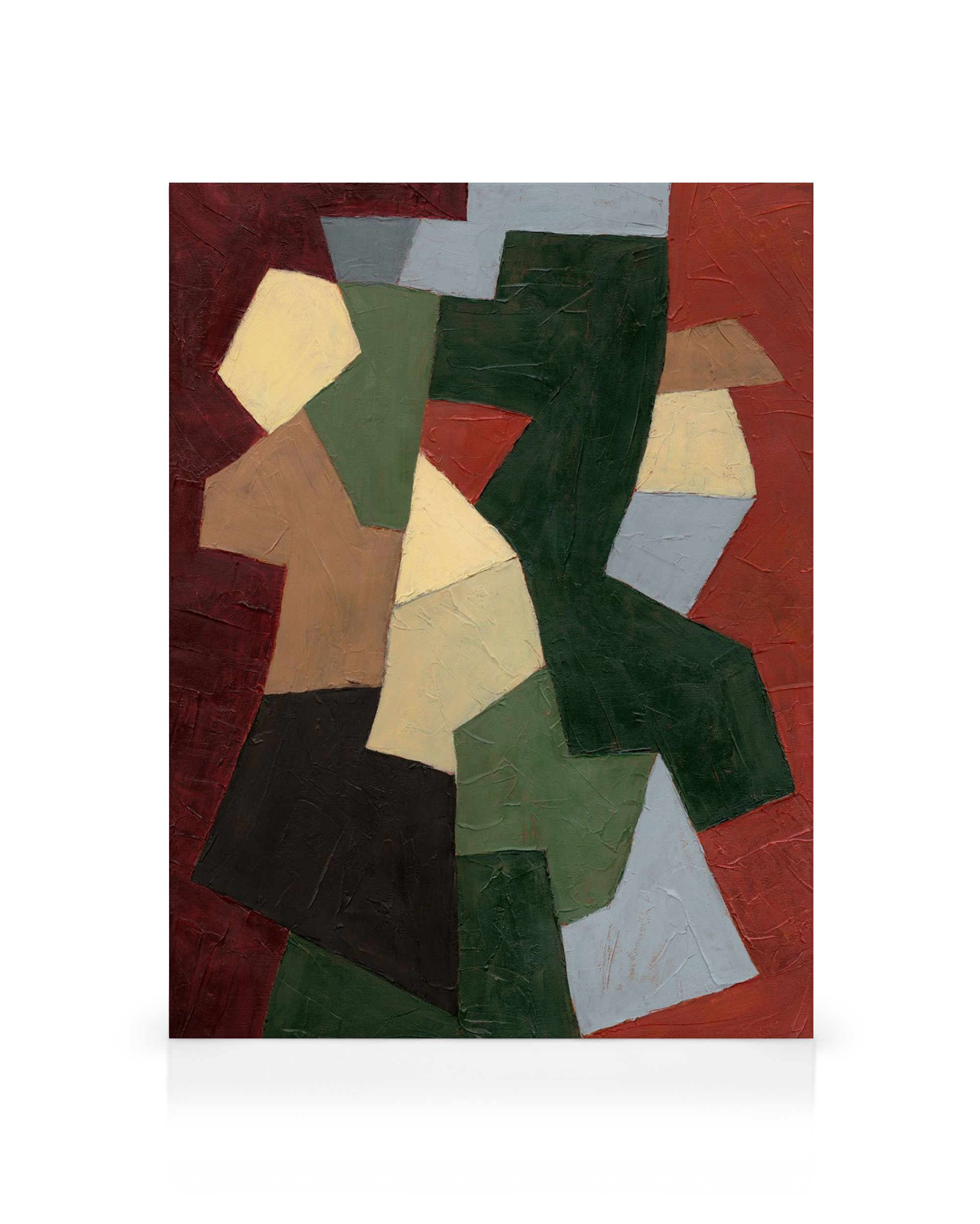 Lienzo con formas abstractas en verde, marrón, beige, gris y negro sobre un fondo marrón rojizo intenso. Las pinceladas audaces le dan al lienzo un aspecto texturizado.