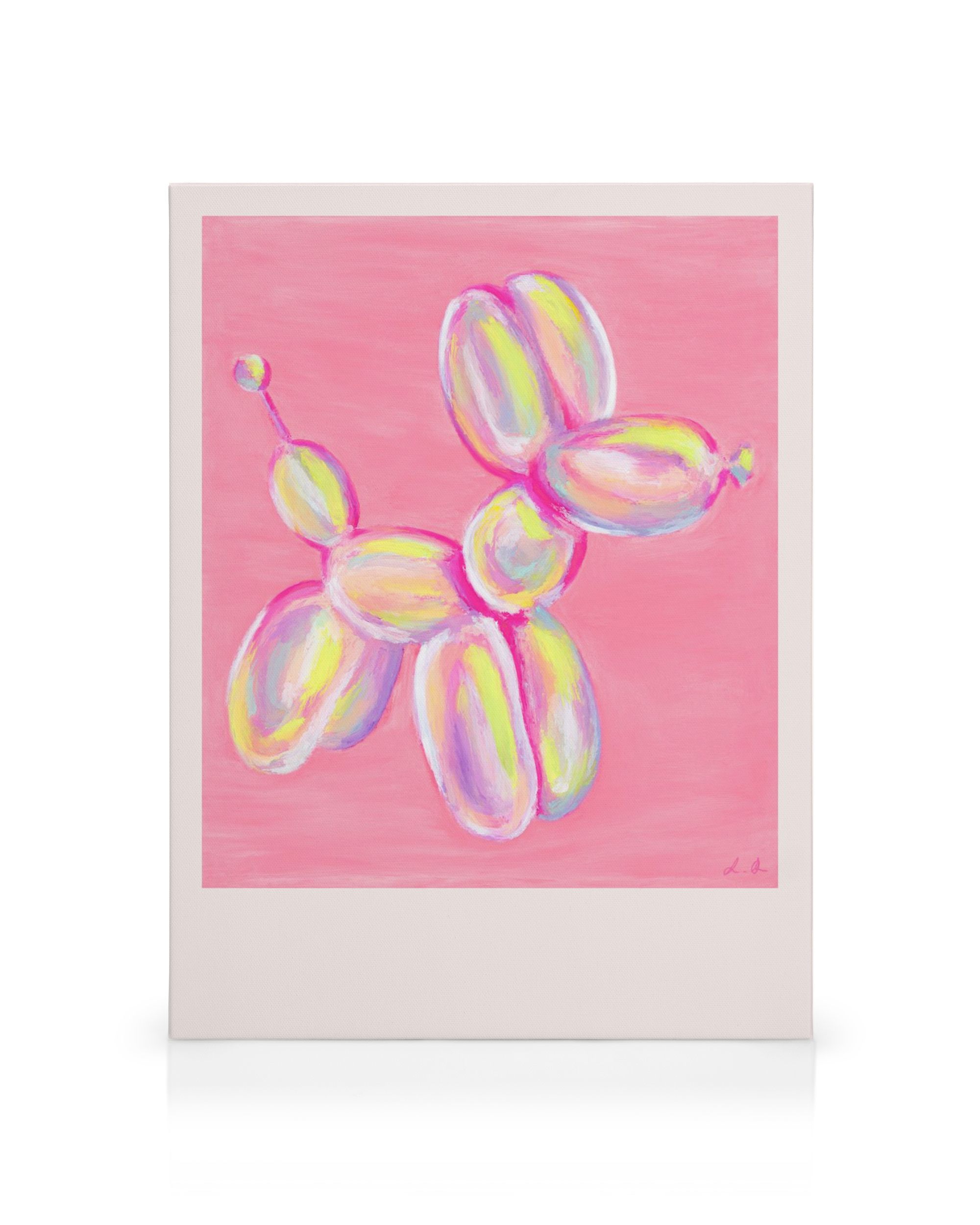 Un impresionante Lienzo de una escultura de perro globo colorido contra un fondo rosa suave. Los globos en amarillo, rosa y blanco destacan vívidamente en este arte mural único, perfecto para añadir un toque lúdico a tu hogar.