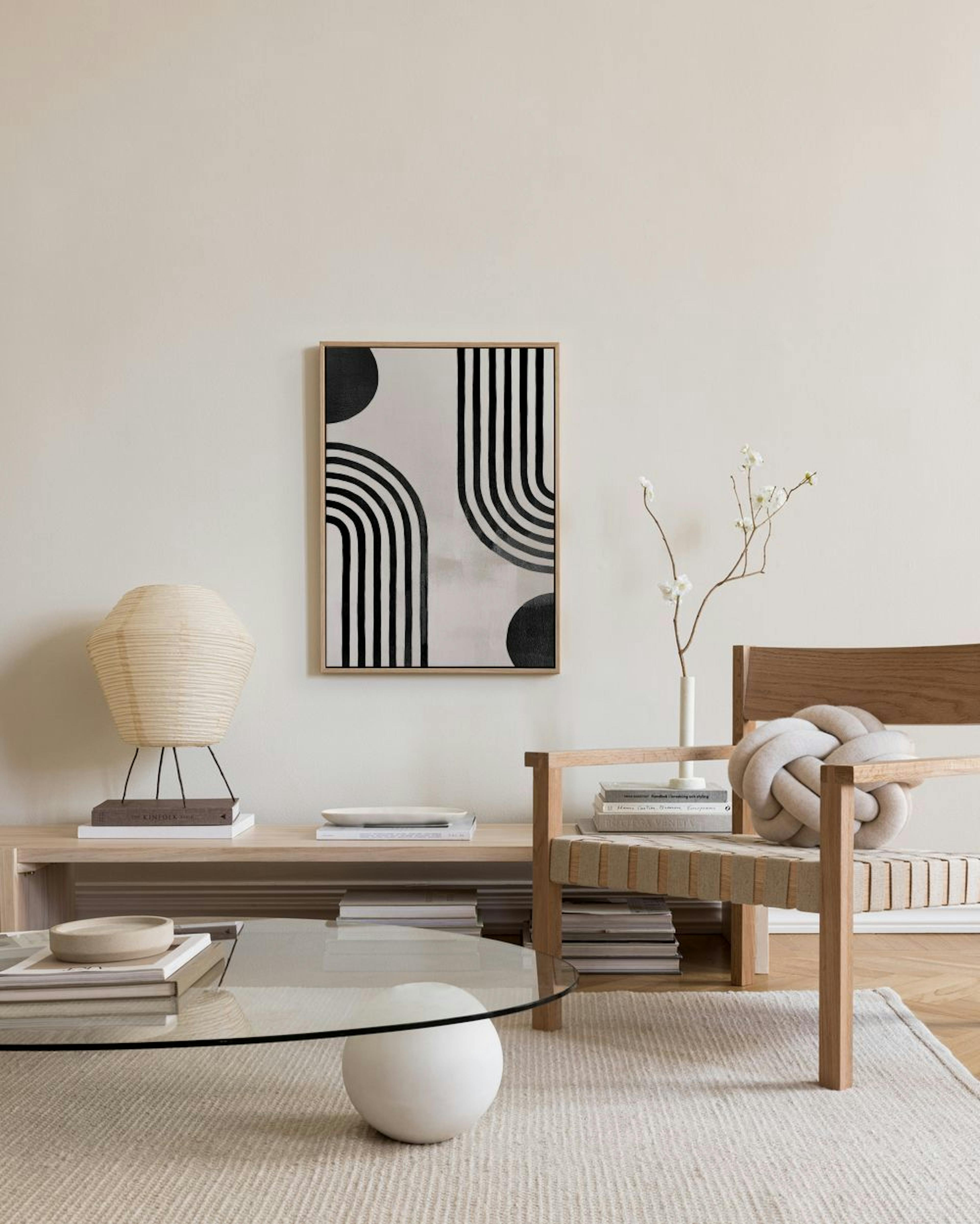 Ilustración gráfica con líneas y círculos negros sobre un fondo beige. Añada este bonito lienzo abstracto a una habitación de su hogar, donde la estructura de color le da al lienzo una agradable dimensión y profundidad.