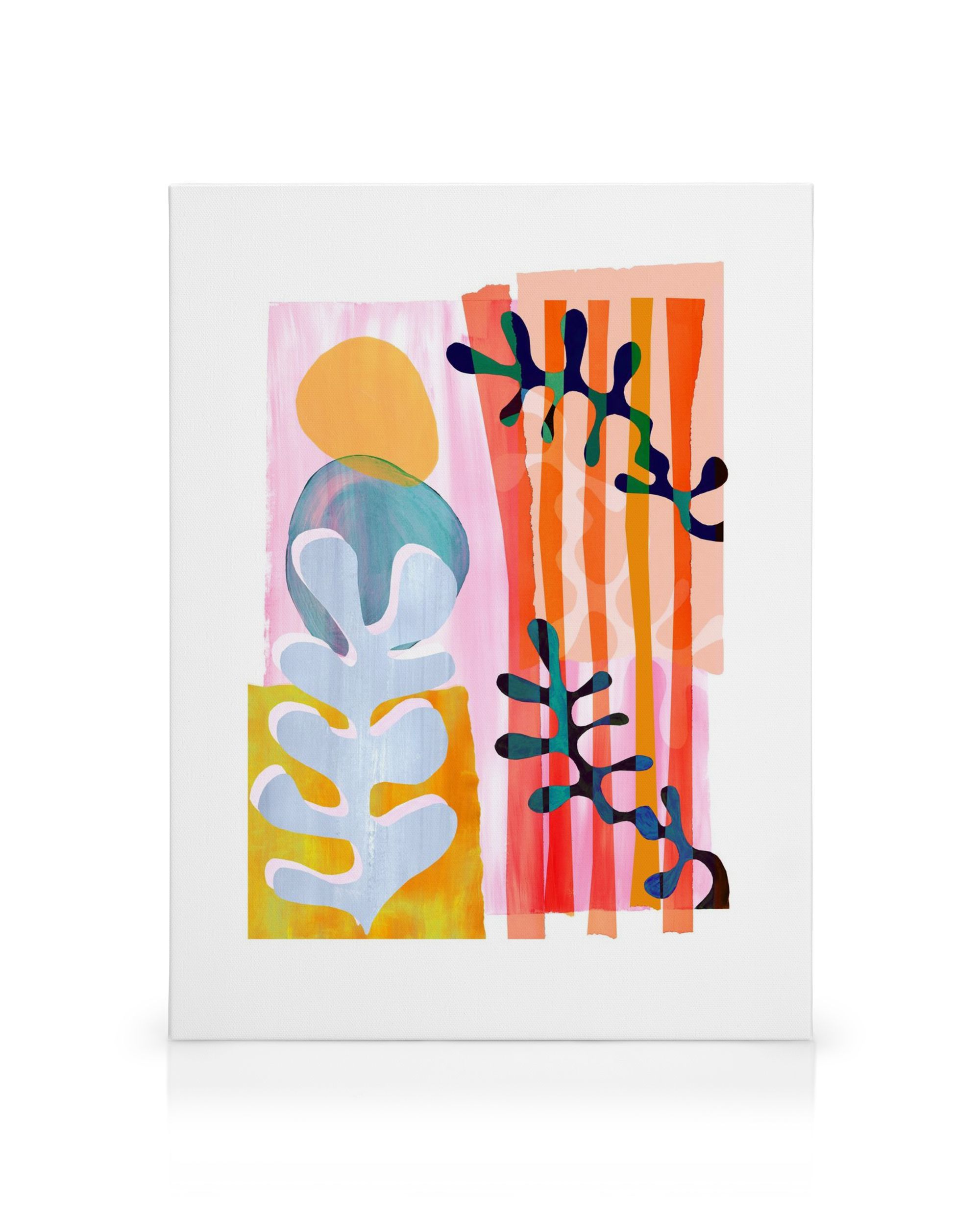 Desde $29.96Impresión abstracta colorida en lienzo con rayas rosadas, amarillas y naranjas, círculos azules y amarillos, y patrones de hojas en azul, negro y amarillo sobre un fondo blanco. Una pieza vibrante de arte mural para iluminar cualquier habitación.