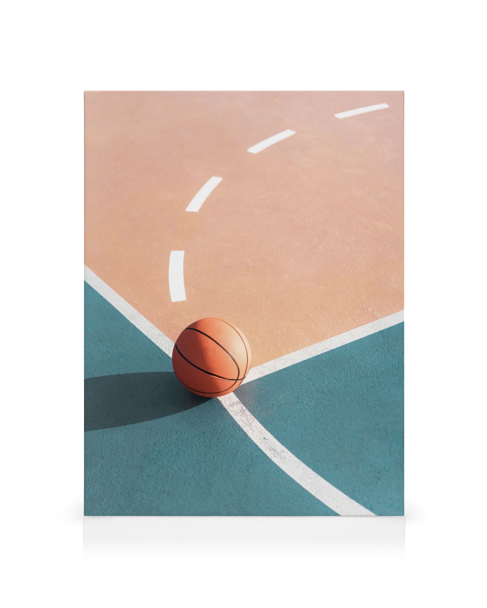 Desde $39.95Capture la esencia del juego con este Lienzo que presenta un vibrante balón de baloncesto naranja en una cancha de colores únicos en durazno y verde azulado, dividida por líneas blancas nítidas y sombras proyectadas por la luz del sol.