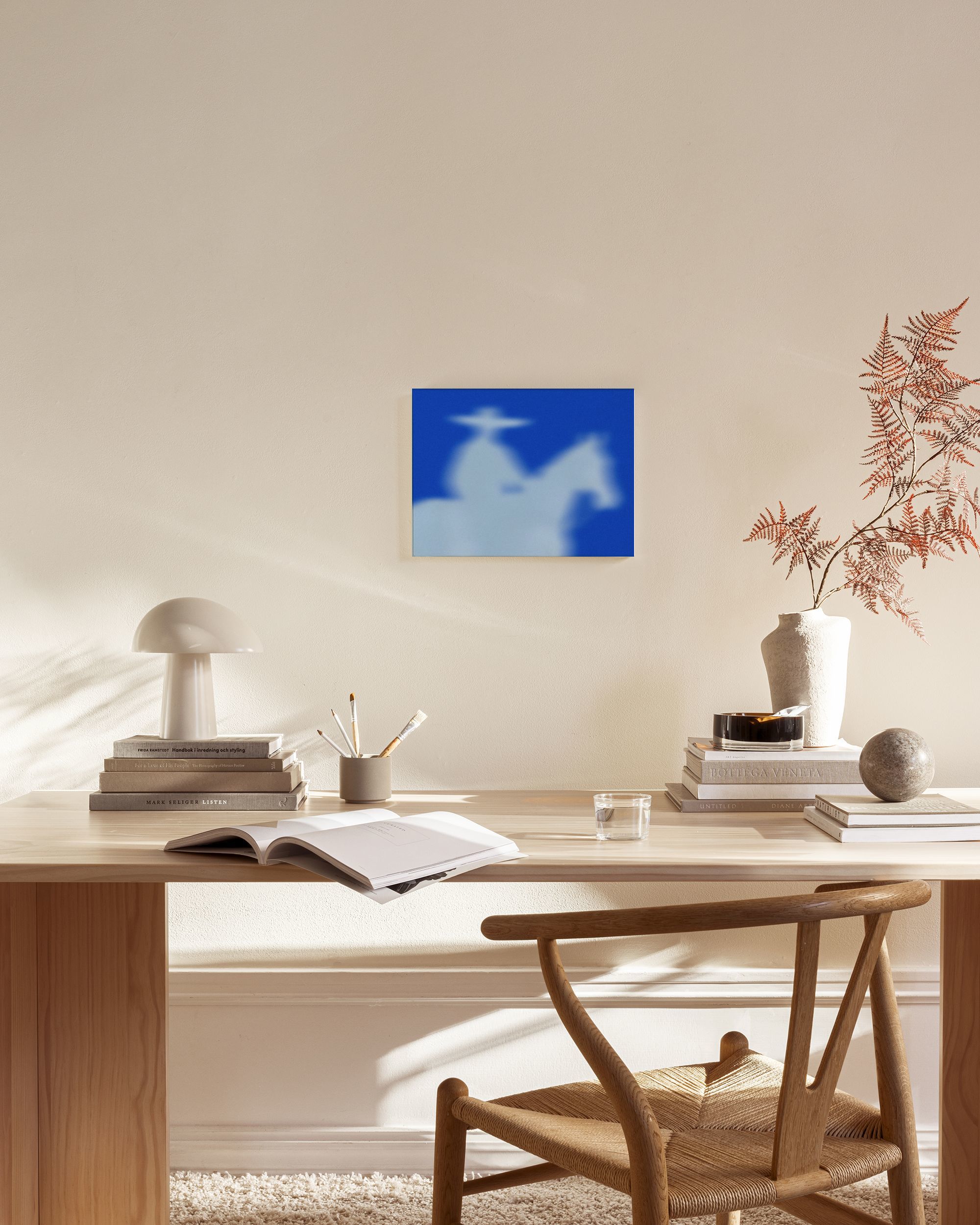 Desde $29.96Un lienzo que presenta la silueta borrosa de una persona a caballo en suaves tonos azules y blancos. El efecto de ensueño crea un aspecto tranquilo y misterioso.