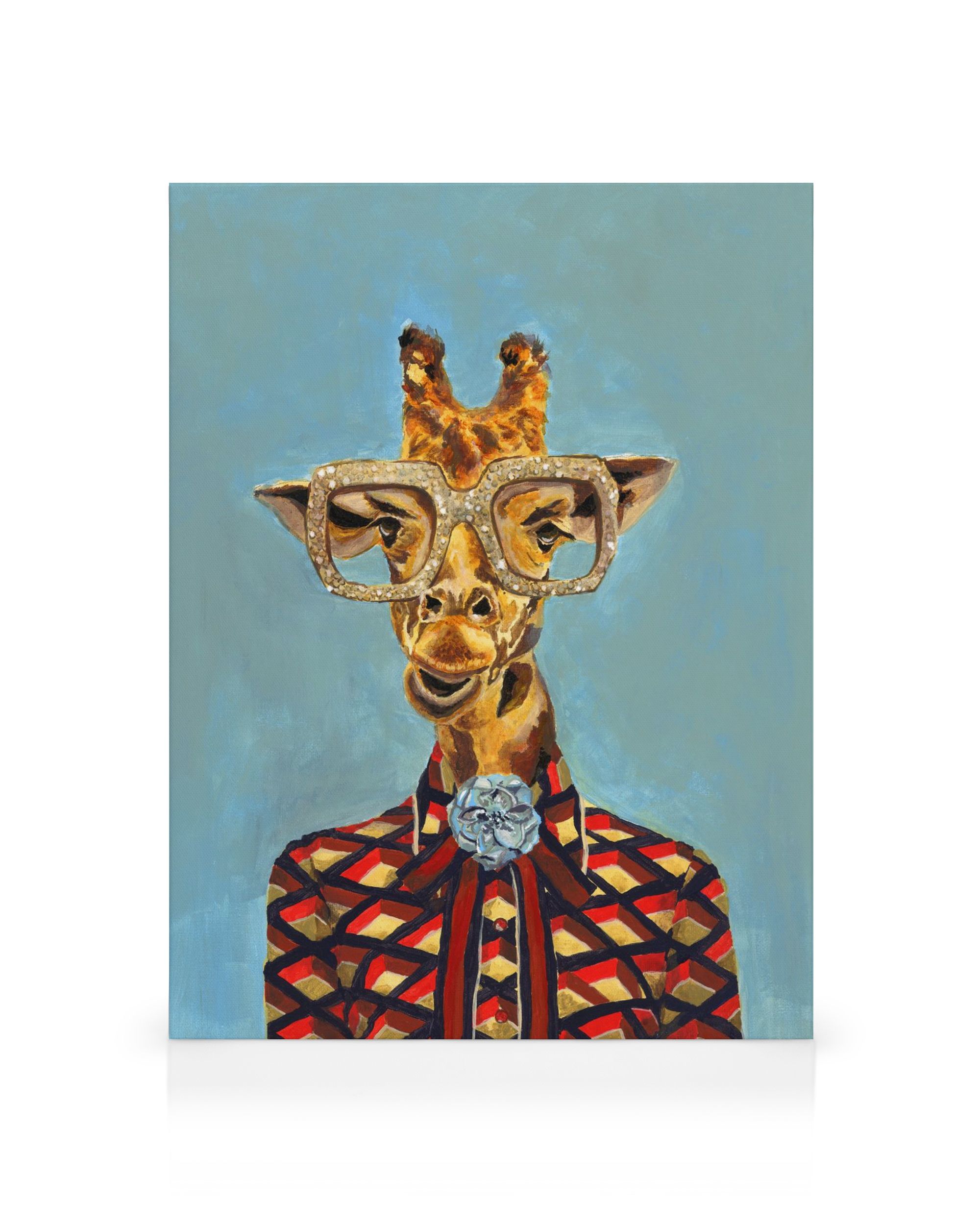 Desde $39.95Un lienzo colorido de una jirafa con gafas y una chaqueta roja, negra y dorada con flores, todo sobre un fondo azul brillante. Una pieza de arte mural divertida y peculiar para cualquier habitación.