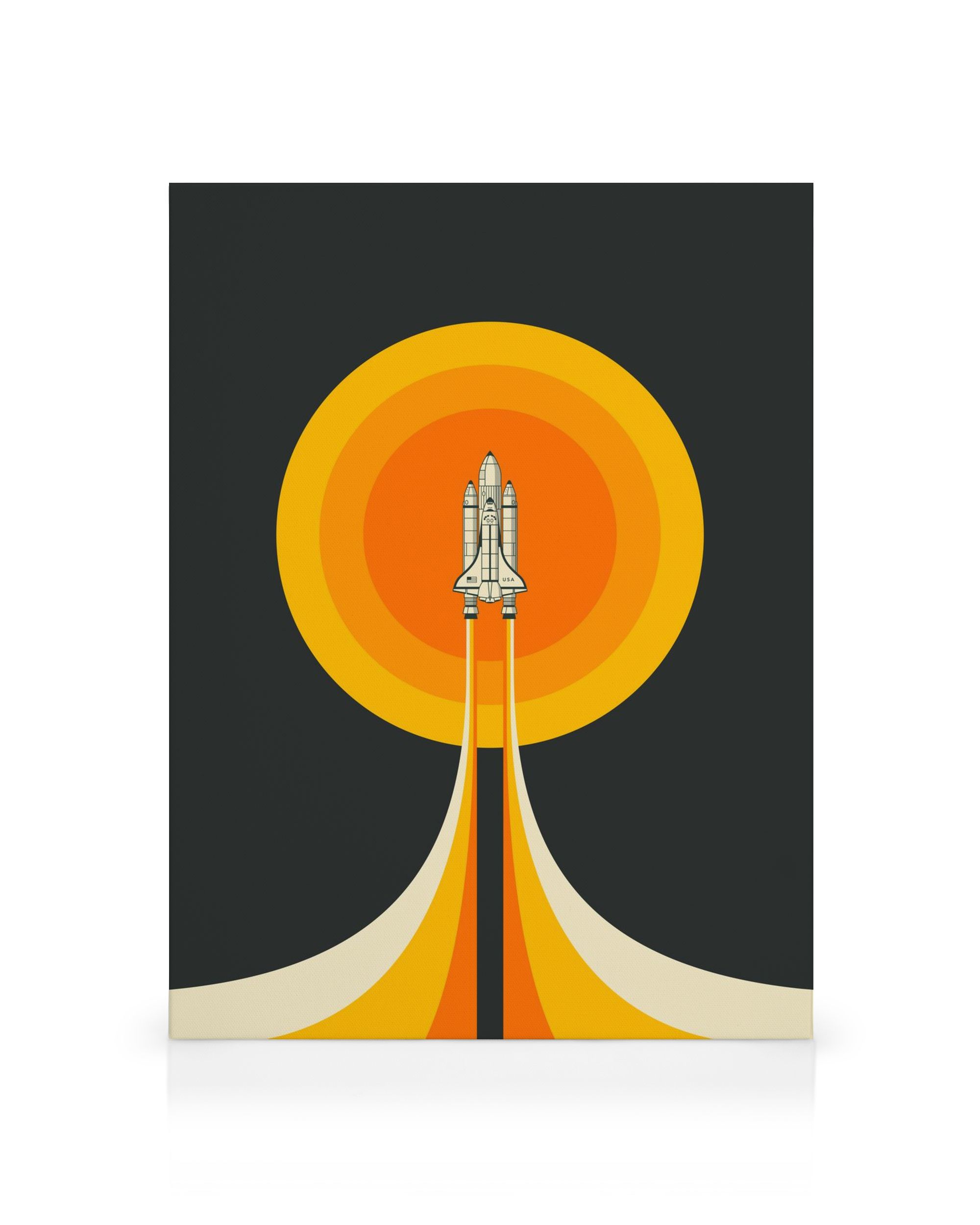 Desde $45.95Un póster retro de un transbordador espacial contra un fondo de atardecer con círculos concéntricos naranjas y negros en lienzo. Este póster minimalista añadirá un toque moderno a tu pared de galería.