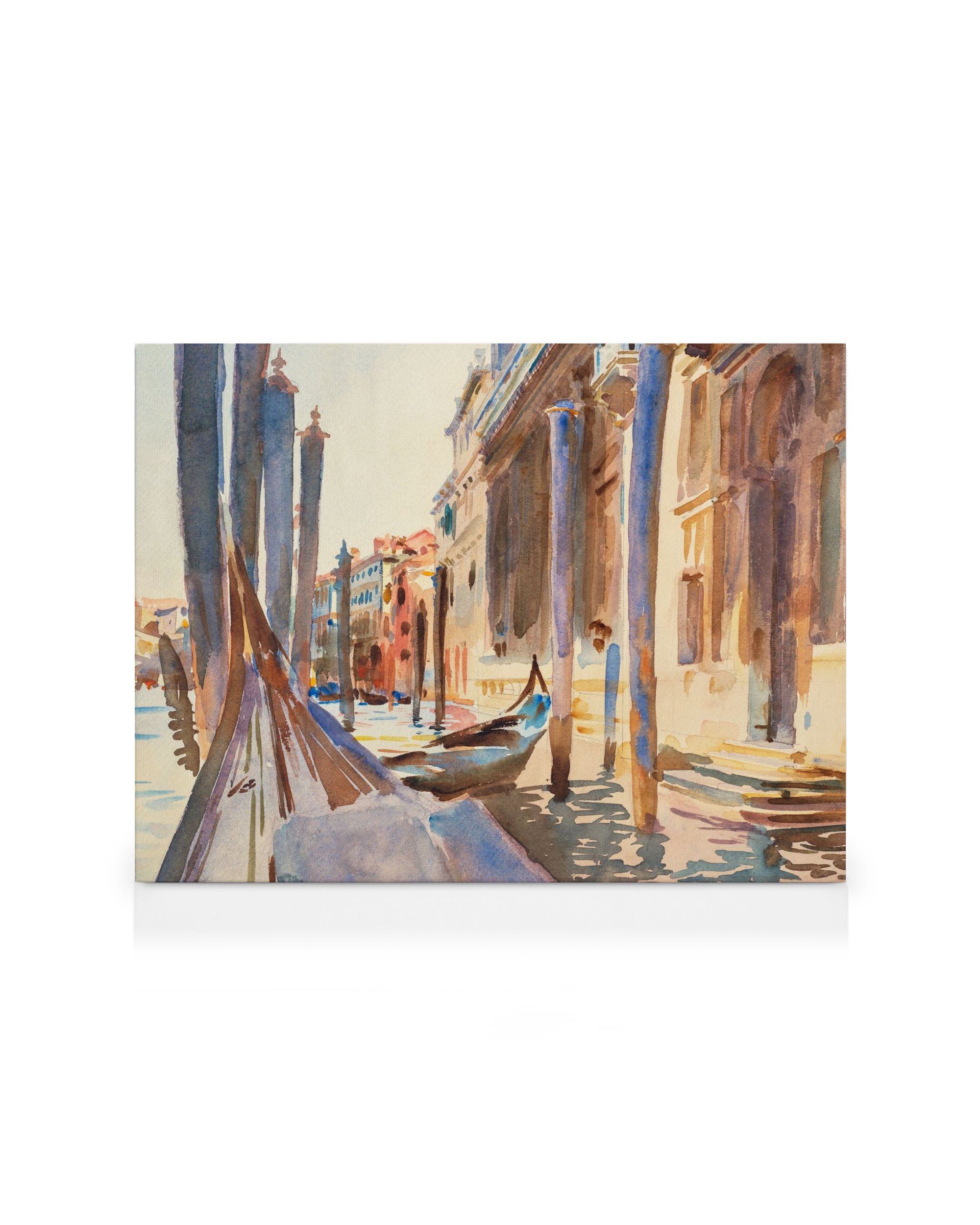 Desde $20.97Un lienzo pintado en acuarela que representa barcos en un canal con edificios reflejados en el agua, en suaves tonos de azul y marrón. El arte de pared perfecto para crear una galería serena en tu hogar.