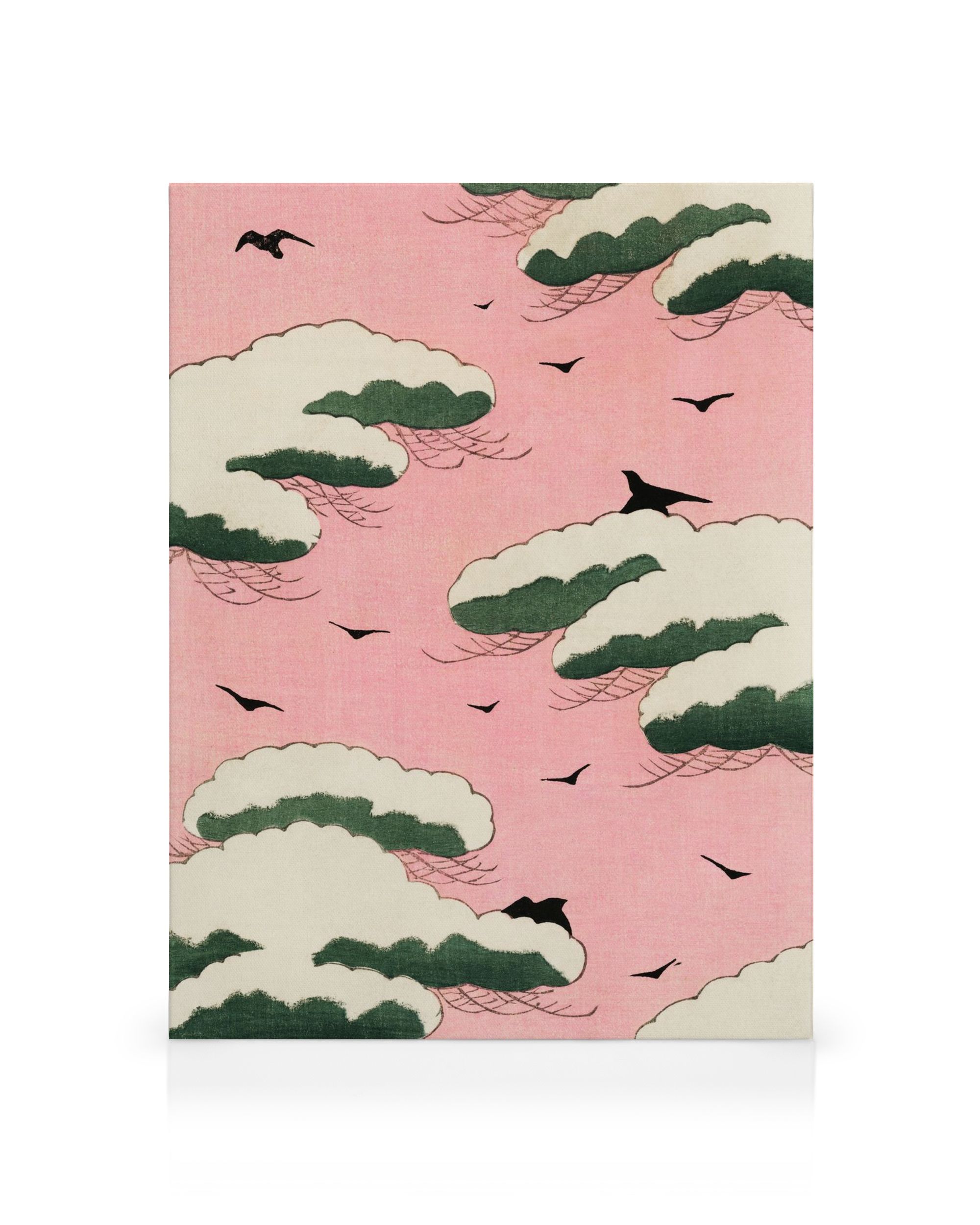 Desde $45.95Un hermoso Lienzo con un fondo rosado que presenta nubes blancas y verdes. Pájaros negros con sombras grises vuelan entre las nubes, creando un estilo artístico y plano.