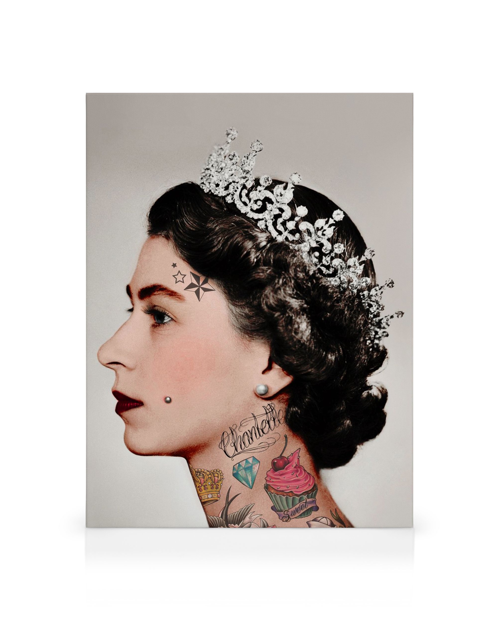 Desde $29.96Perfil lateral en lienzo de una mujer con una tiara, un pendiente de perla y tatuajes brillantes, incluyendo estrellas y un cupcake. Este arte colorido de pared añadirá un toque divertido a cualquier espacio.