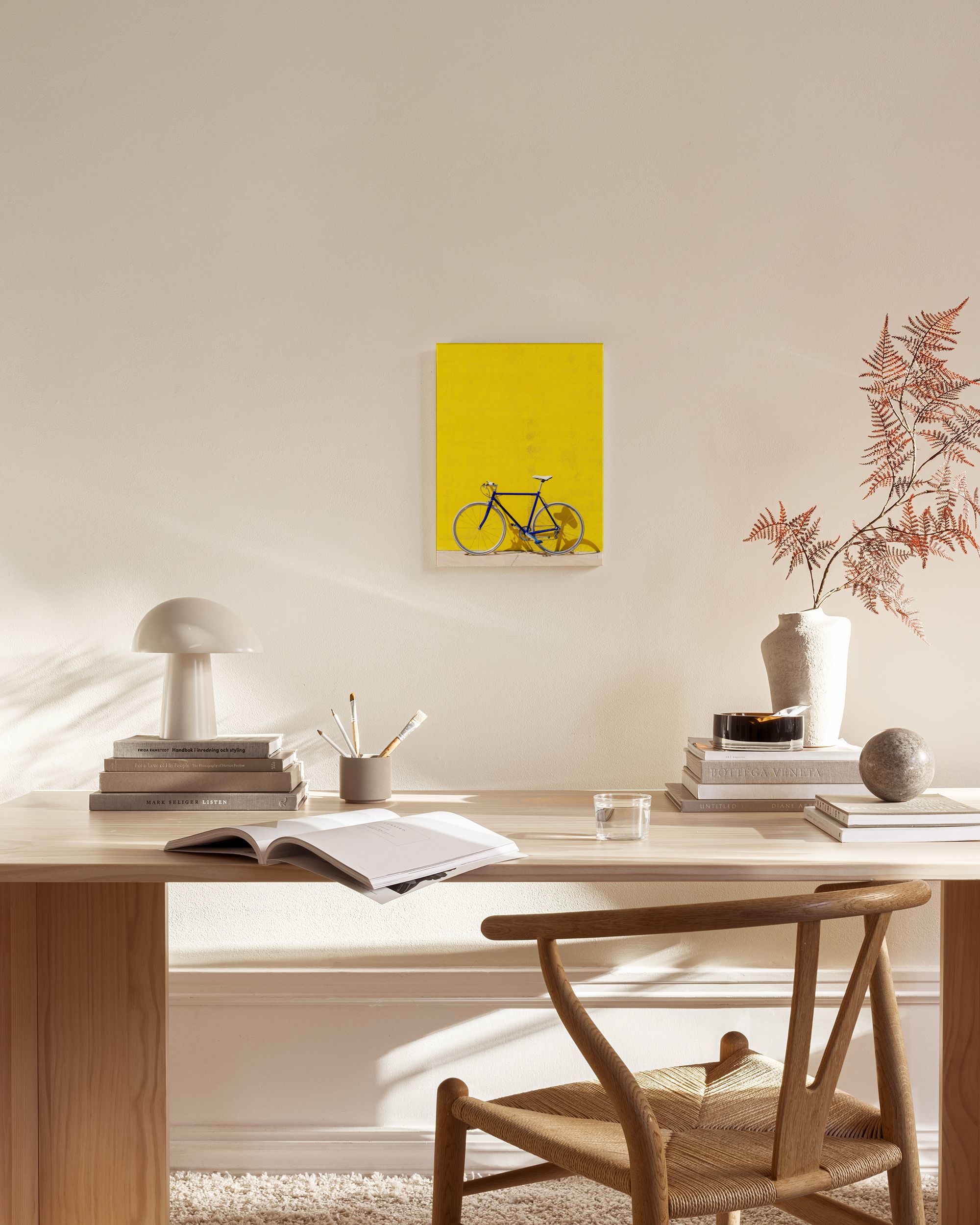 Hermoso lienzo con una bicicleta azul apoyada contra una brillante pared amarilla texturizada. La bicicleta tiene neumáticos blancos y un asiento blanco. Una sombra es visible en el suelo gris debajo.