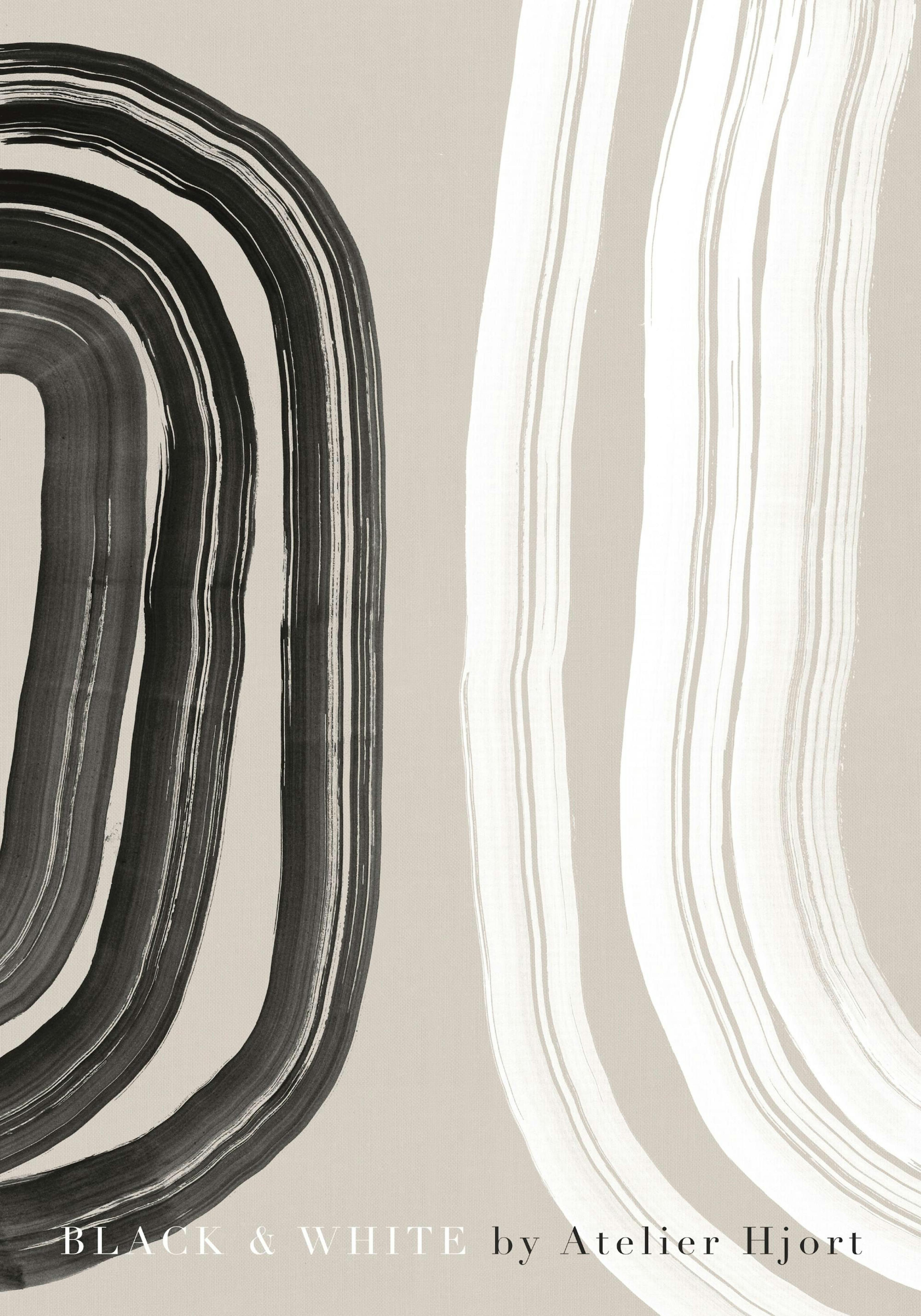 Ilustración de trazos en blanco y negro formando dos círculos separados con un fondo gris-beige. Póster de moda con una sensación de suavidad, perfecto para el dormitorio.