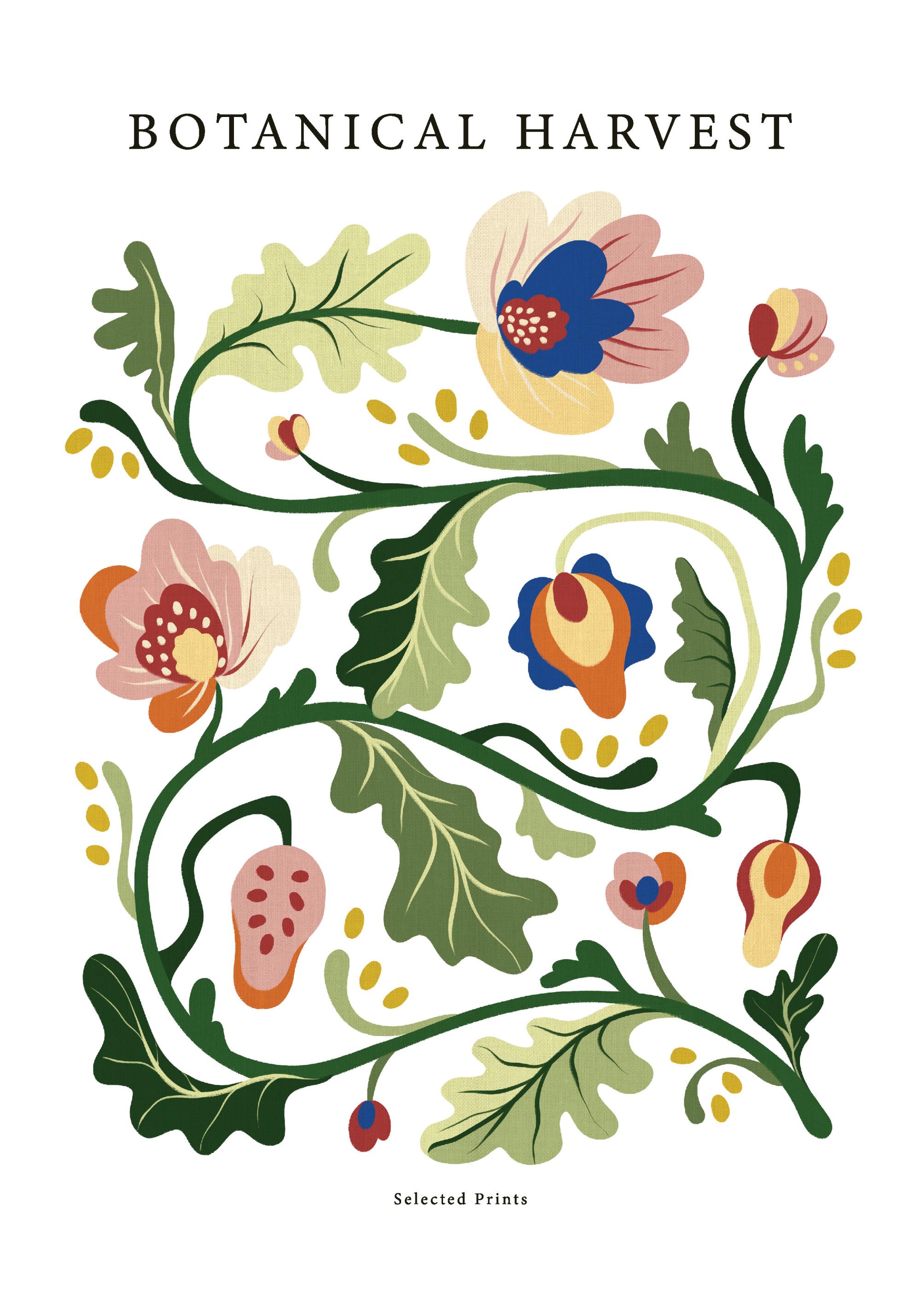 Pósters botánicos con flores de colores verde, beige y amarillo, entre otros, sobre un fondo blanco, con el texto «Botanical Harvest» en la parte superior y «Selected Prints» en la parte inferior. Los pósters florales aportan calma y son ideales para decorar el salón o la habitación. Este póster y el de «Botanical Harvest, n.º 2» son una combinación perfecta.