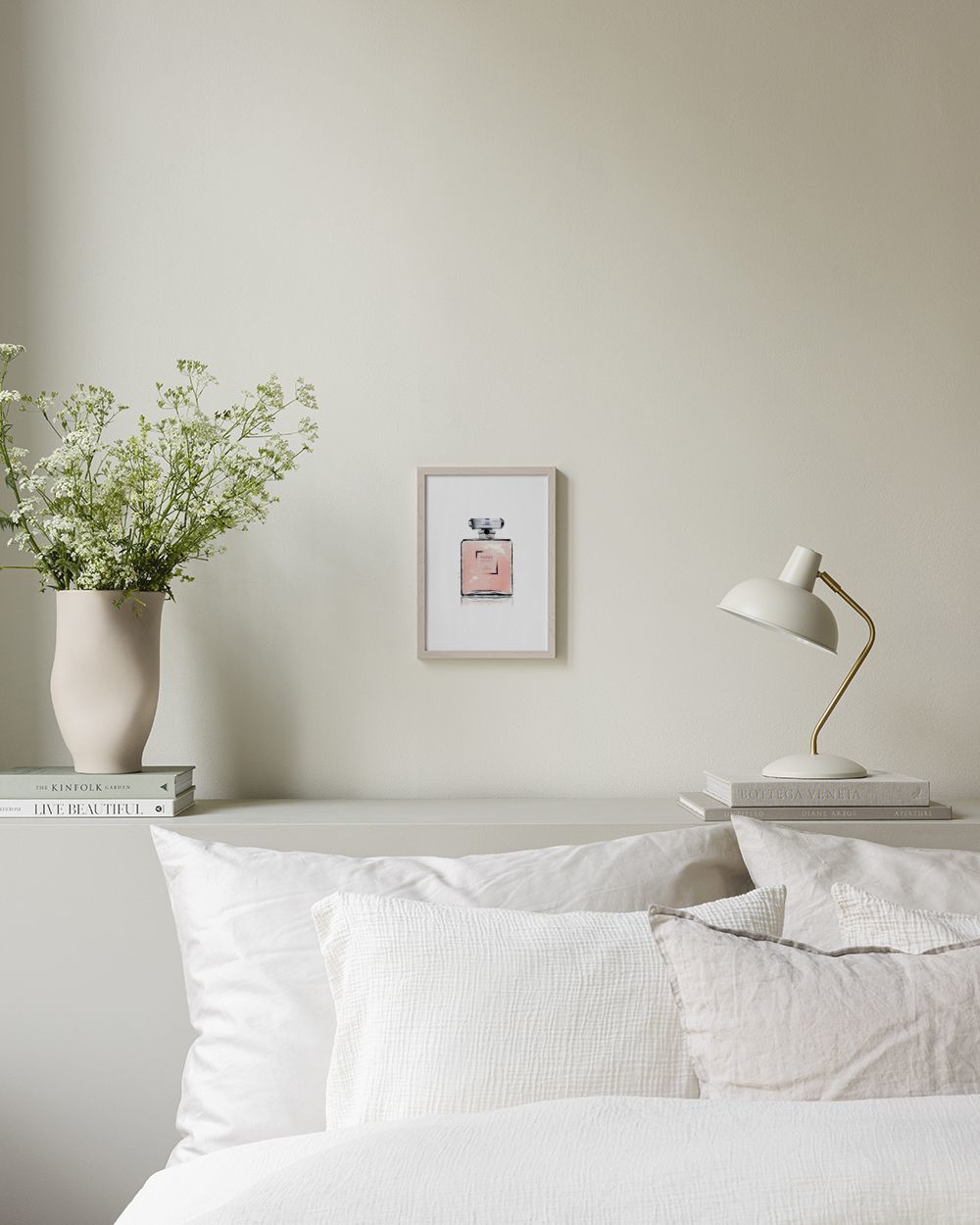 Ilustración en acuarela de un perfume de Chanel con la palabra París escrita en el frasco. Se trata de un póster elegante que funciona en una pared de cuadros o en una estantería. Las diseños con motivos relacionados con el mundo de la moda te ayudan a componer de manera muy sencilla una pared de cuadros moderna y chic al mismo tiempo.