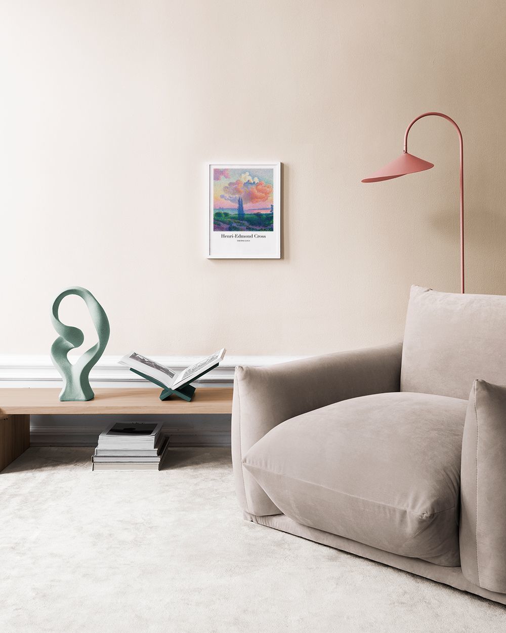 Póster de arte con un paisaje cerca del mar con follaje y bonitos tonos de rosa y violeta. Motivo realizado por el famoso artista Henri-Edmond Cross.