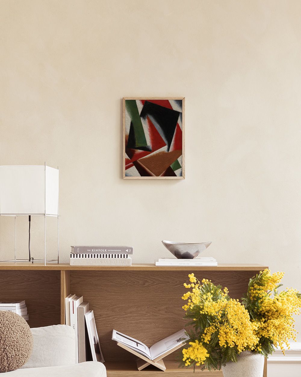 Póster abstracto con triángulos llamativos en negro, verde y marrón sobre un fondo rojo y blanco. Composición dinámica con sombras y luces intensas.