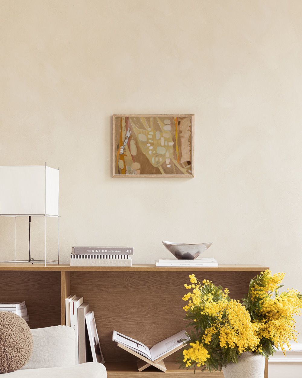 Póster abstracto con tonos tierra en marrones, beiges y amarillos. Presenta formas ovaladas y rectangulares con parches blancos y verdes para crear contraste.