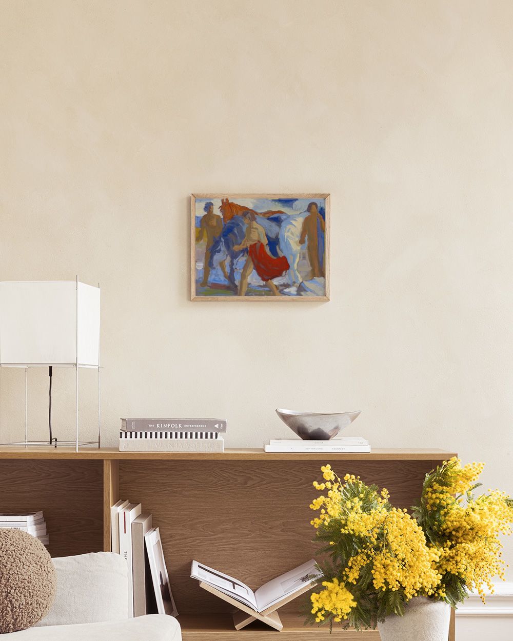 Póster abstracto con tres figuras y dos caballos en colores rojo, azul, marrón y blanco con un estilo suelto e impresionista.