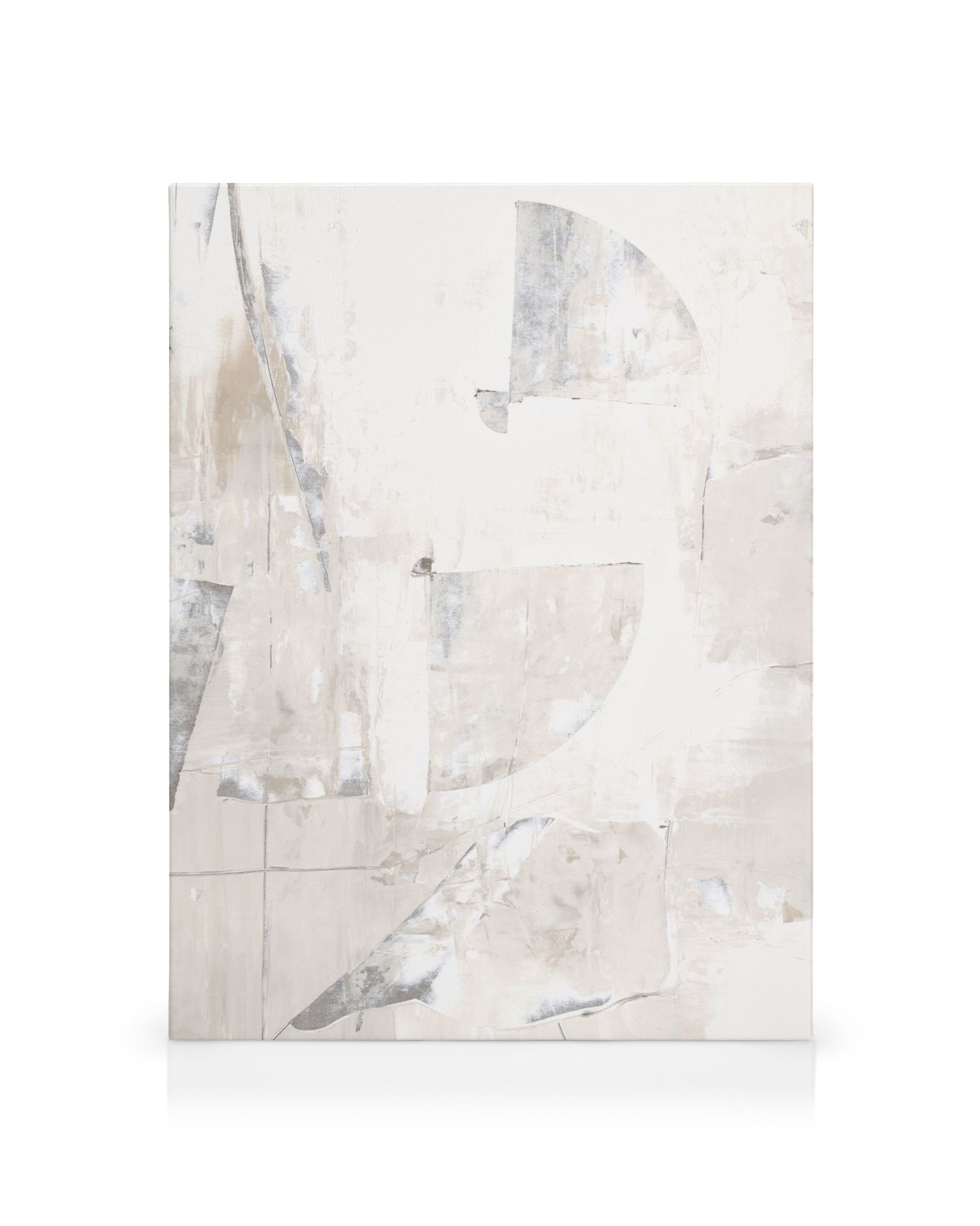 An abstract canvas print with geometric shapes in white and grey. Visible textures and rough brush strokes against a white background. This minimalist wall art is perfect for any gallery wall.