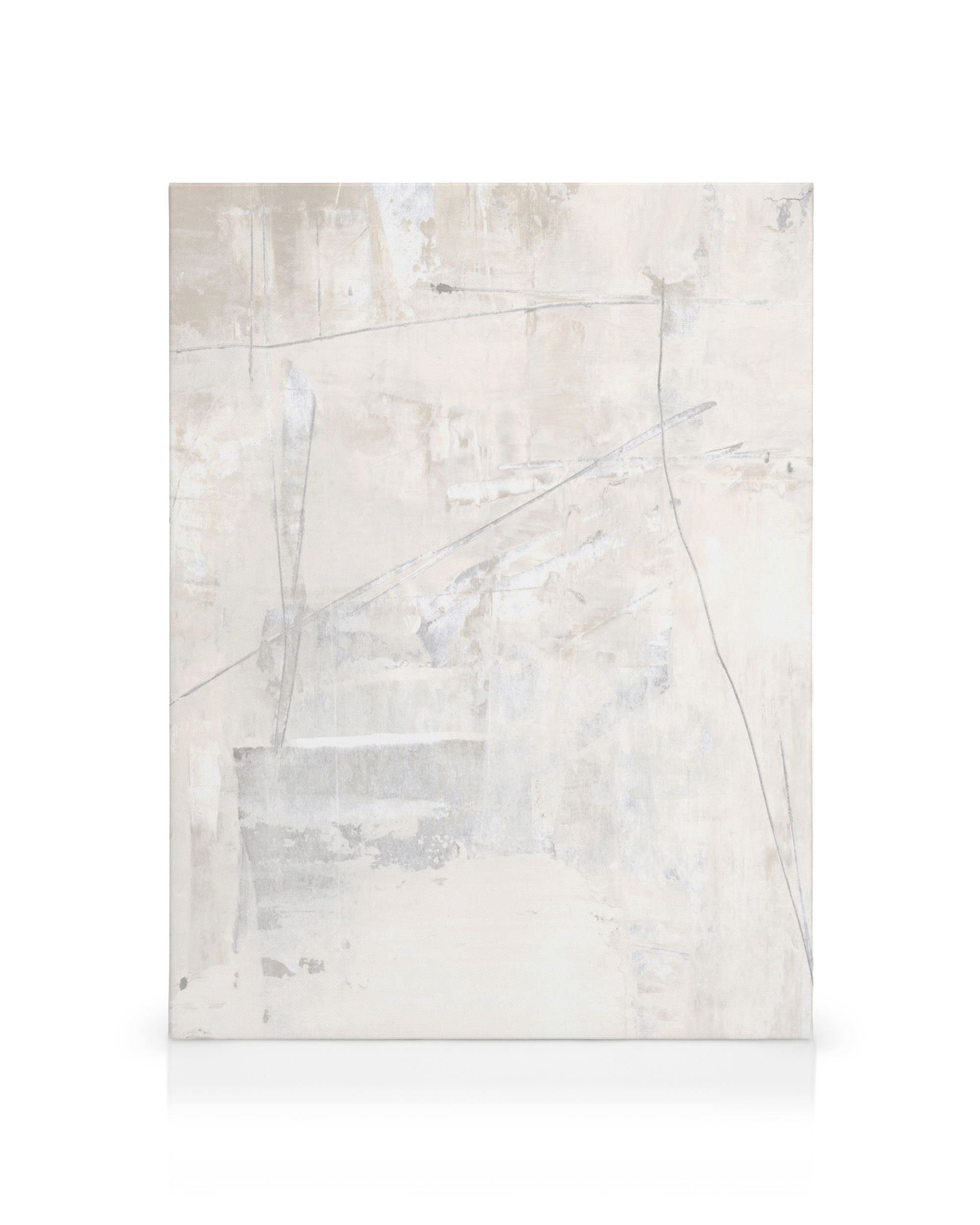 An abstract canvas print with textured brushstrokes in shades of white, grey and light brown, and thin dark lines intersecting the artwork. A minimalist piece perfect for any room in your home.
