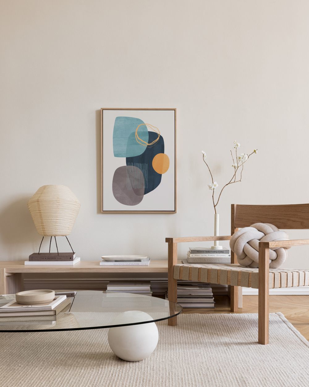 Abstract canvas print with overlapping geometric shapes in shades of blue, navy, tan, and orange on a textured white background. A trendy addition to your home decor.