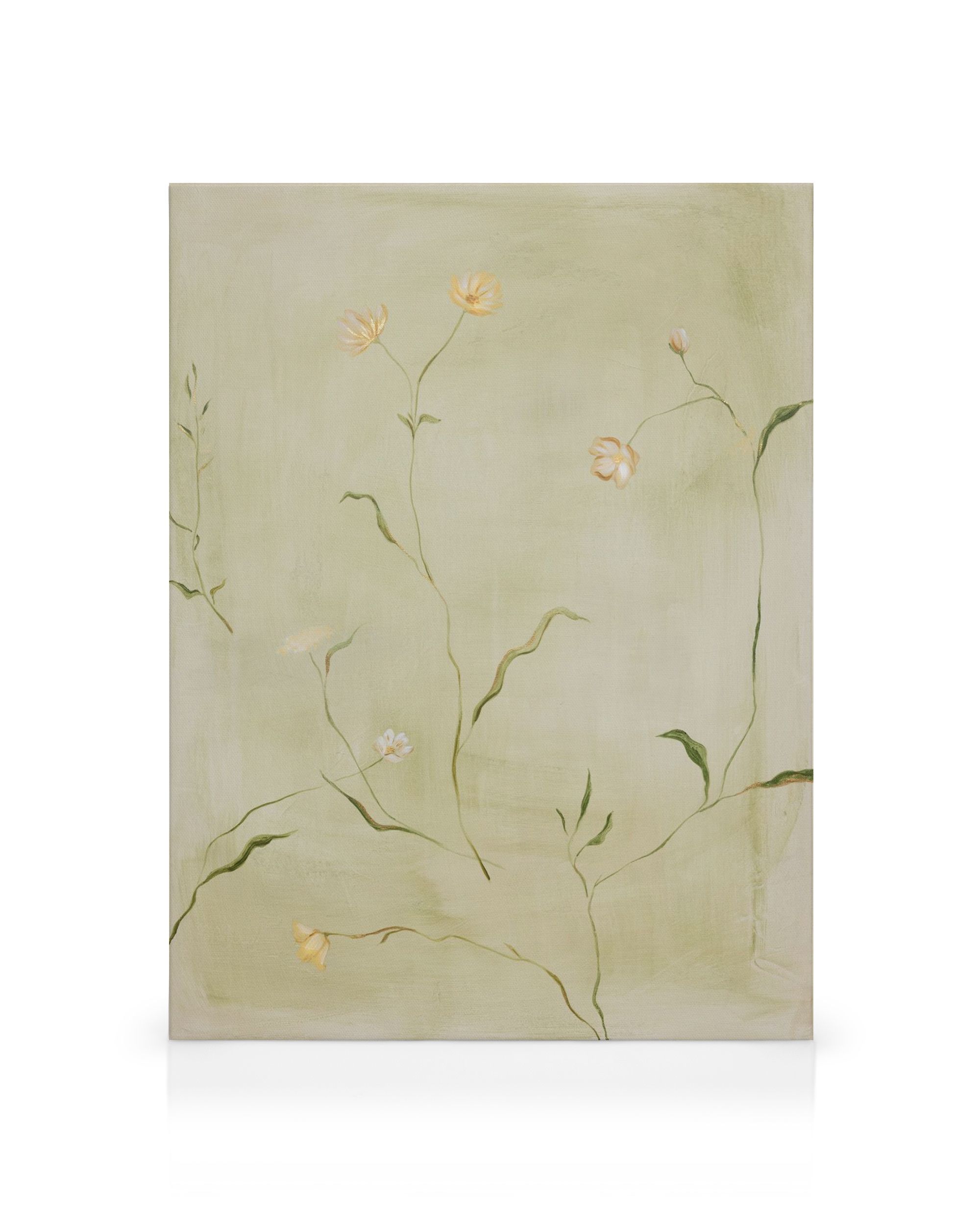 Bring nature indoors with this delicate canvas print. Soft yellow and white flowers dance on light green stems.