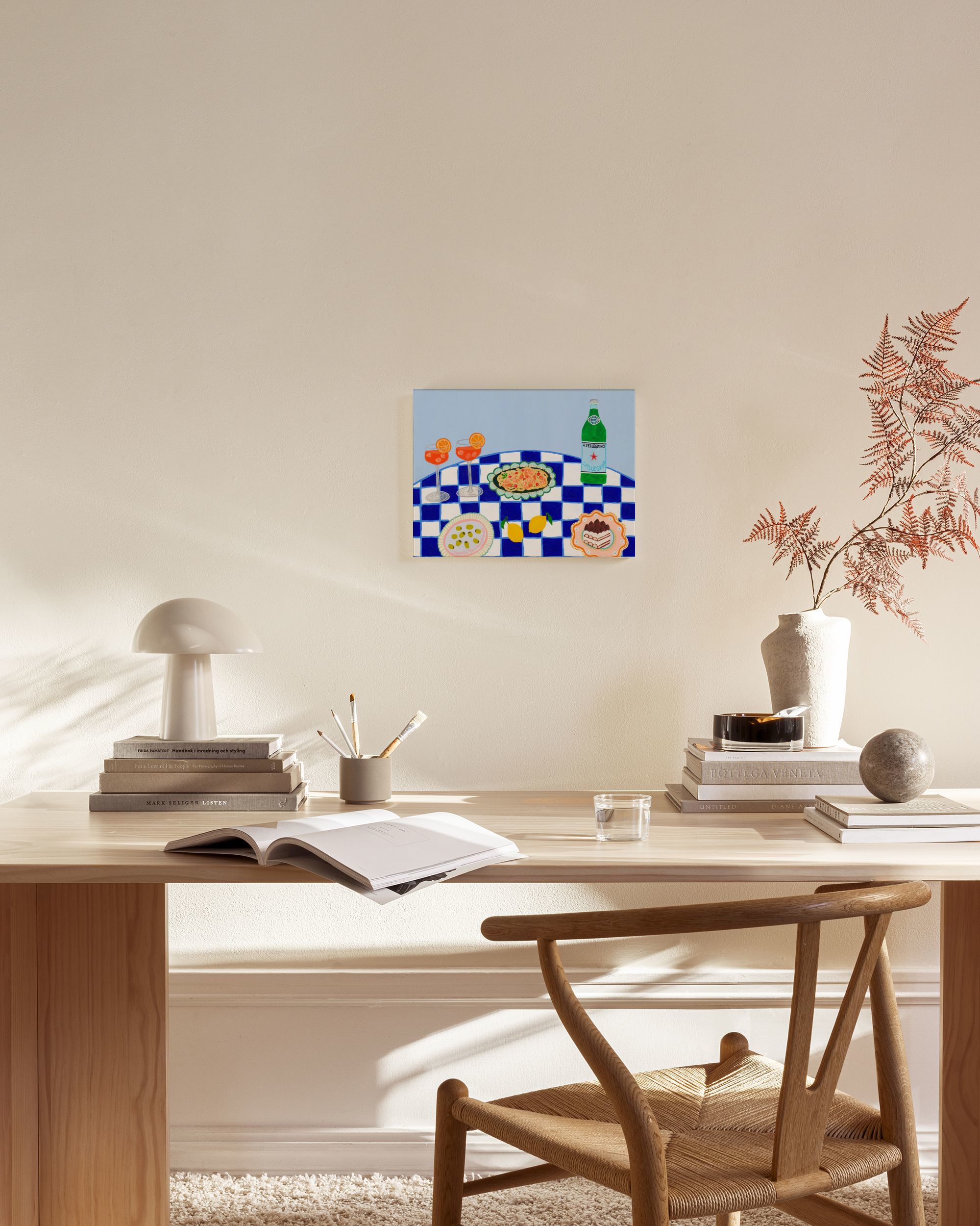 From $39.95A canvas print depicting a party table with food and drinks. The print features a blue and white chequered tablecloth, glasses with orange slices, a green bottle, and plates of pizza, olives, lemons, and pie on a light blue background. Perfect for kitchen wall art or a gallery wall.