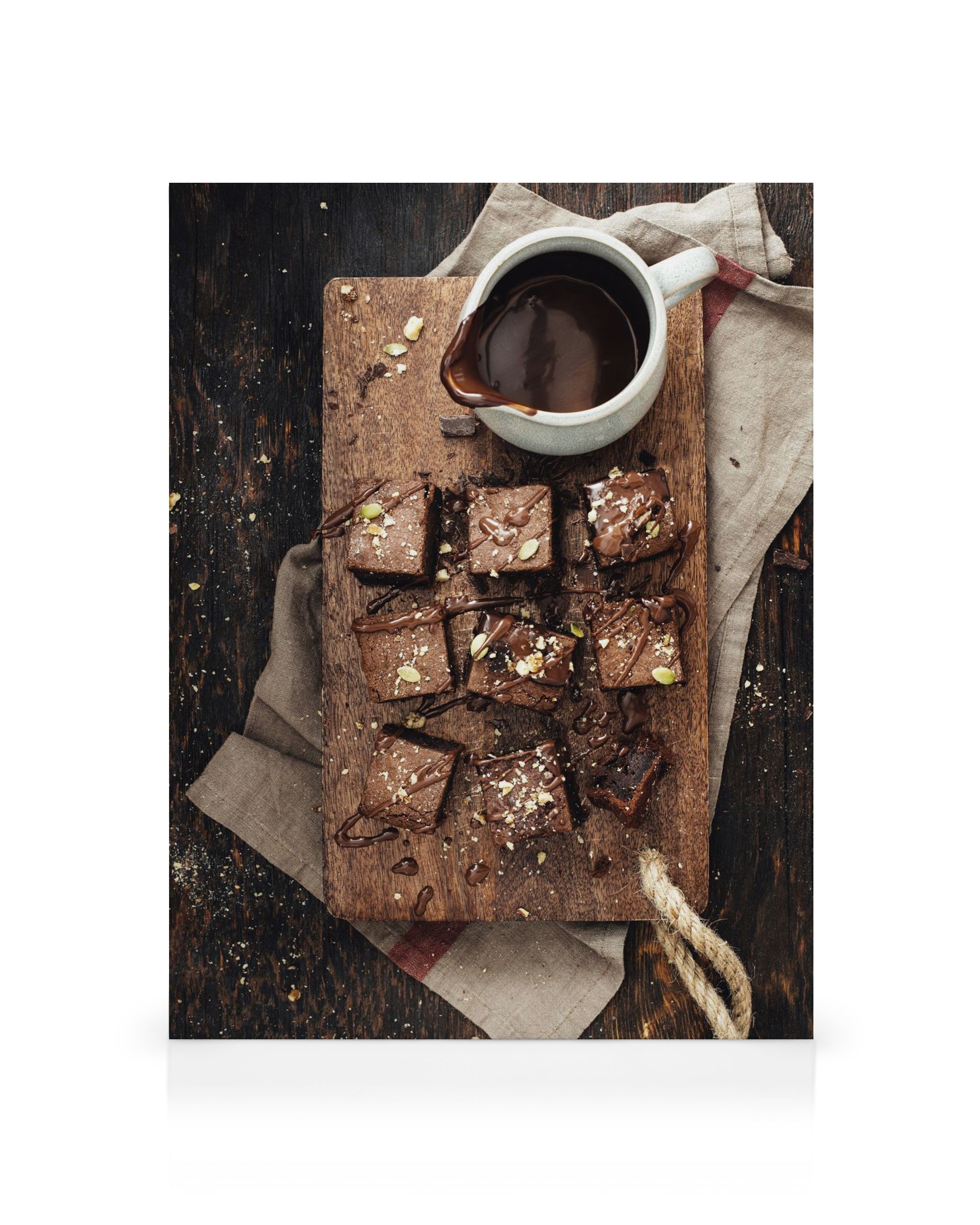 A canvas print showing chocolate squares on a wooden board, with toppings and a cloth. Perfect for your kitchen or dining room wall.