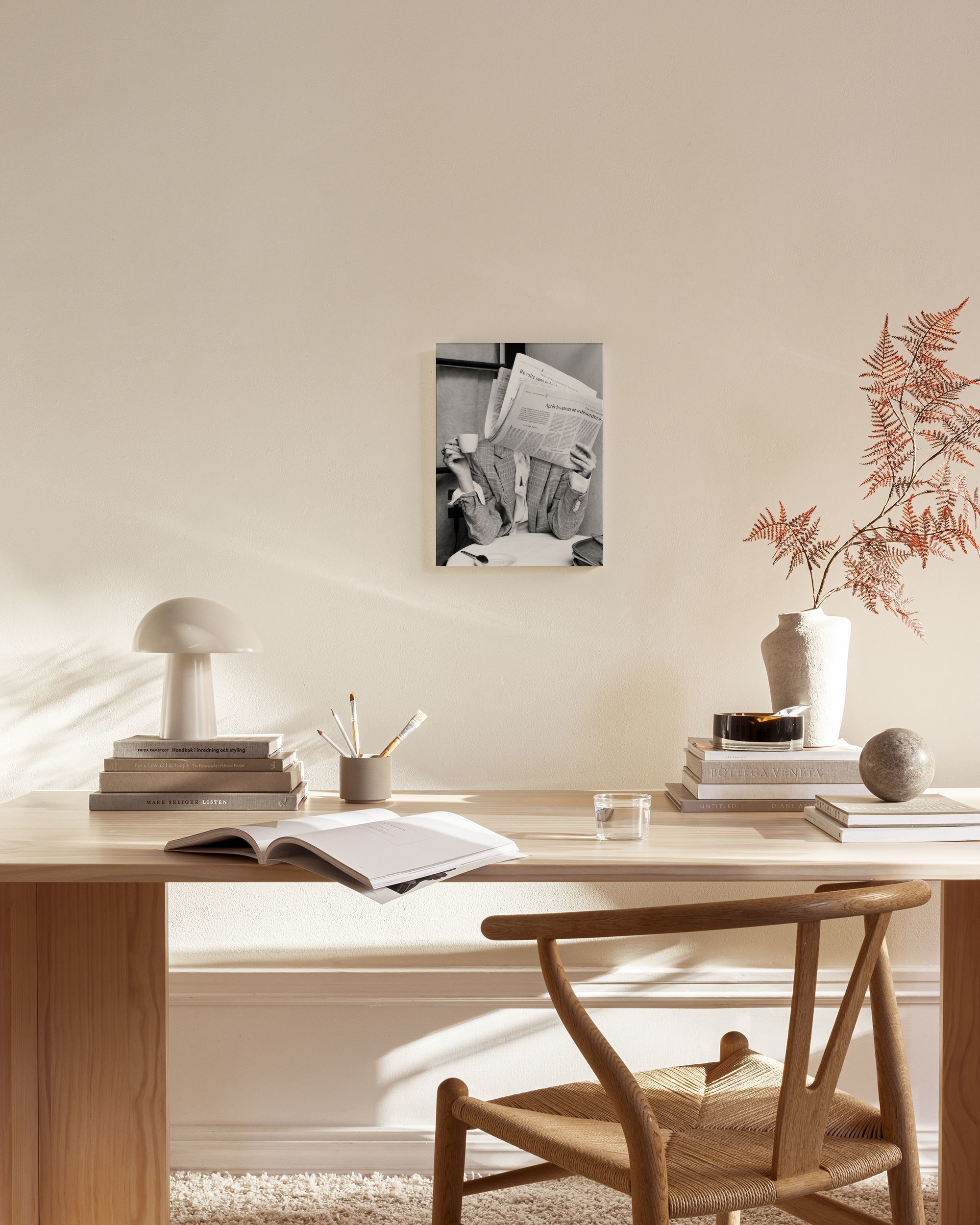 A canvas print featuring a black and white photo of a person reading a newspaper at a table, wearing a checkered jacket. The textures of paper and fabric add softness to this unique wall art piece.