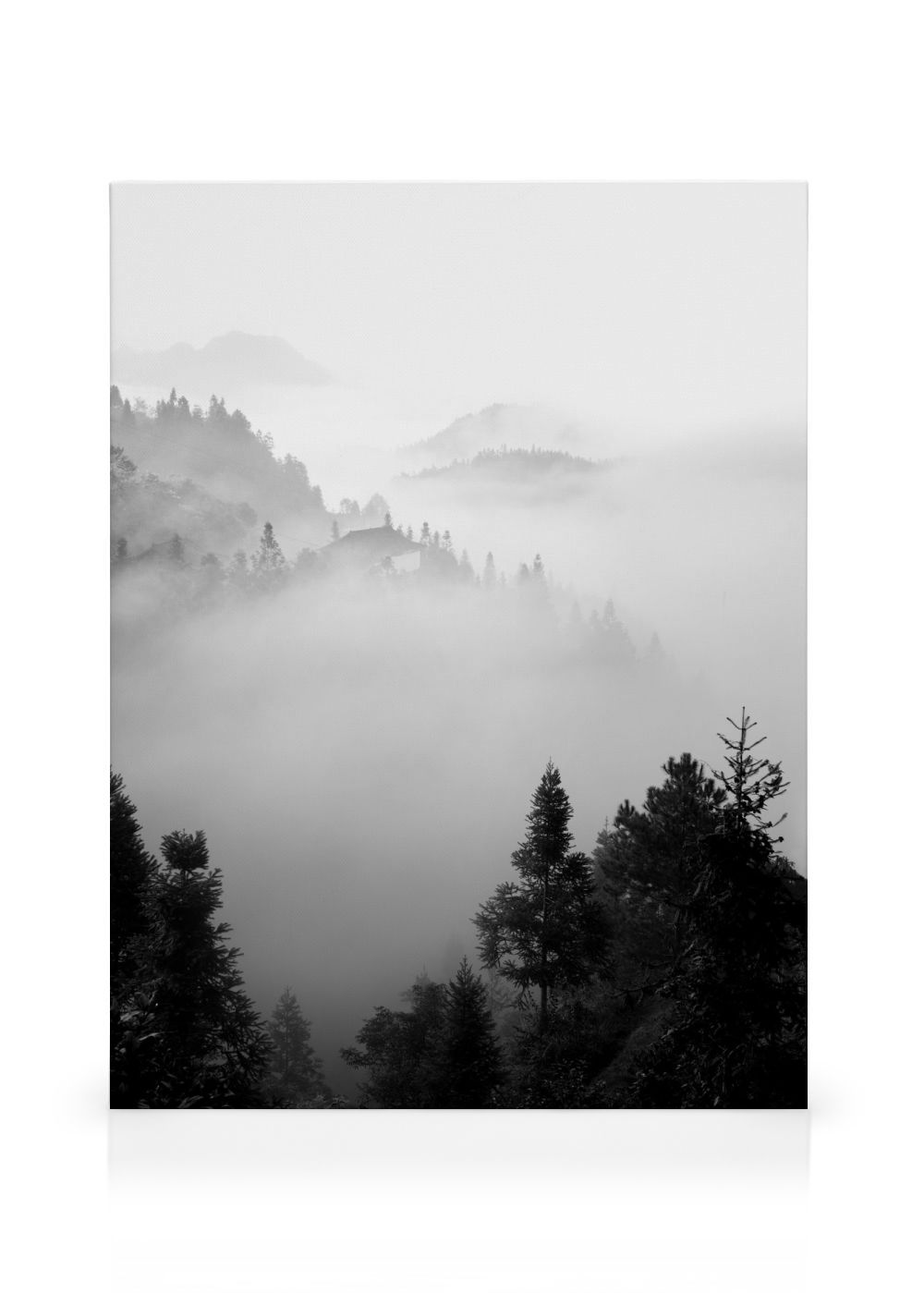 Stunning black and white photo print on canvas, depicting misty mountains and trees. The layered hills and fog create an atmospheric landscape.