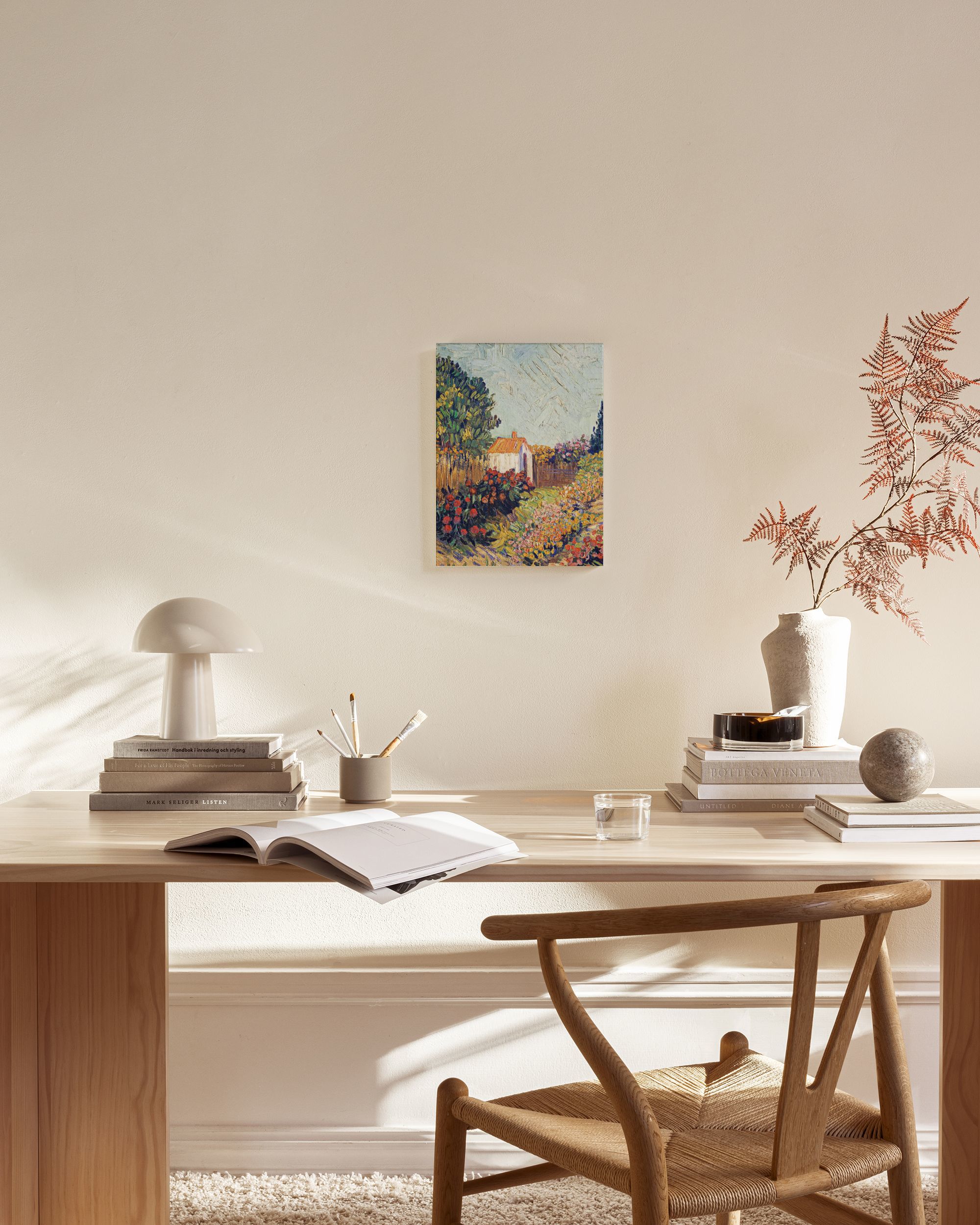 From $23.97Beautiful canvas print with thick brush strokes depicting a colourful garden. The art shows a small white house with a red roof surrounded by bright flowers in red, yellow, and pink. A green garden with a brown fence completes this lovely wall art, perfect for your home.