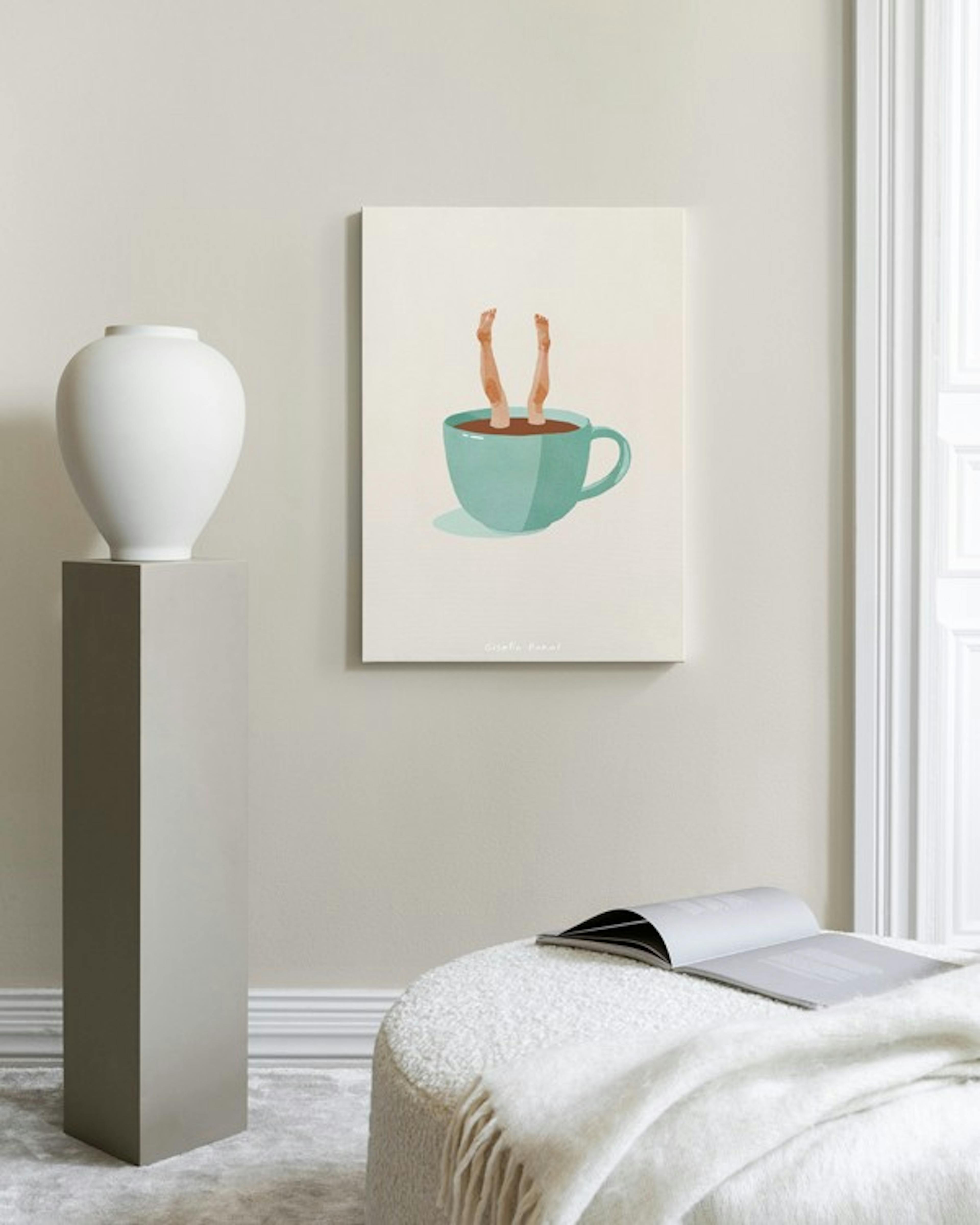 A quirky canvas print showing a large teal cup on a beige background with a pair of human legs sticking out of the top.