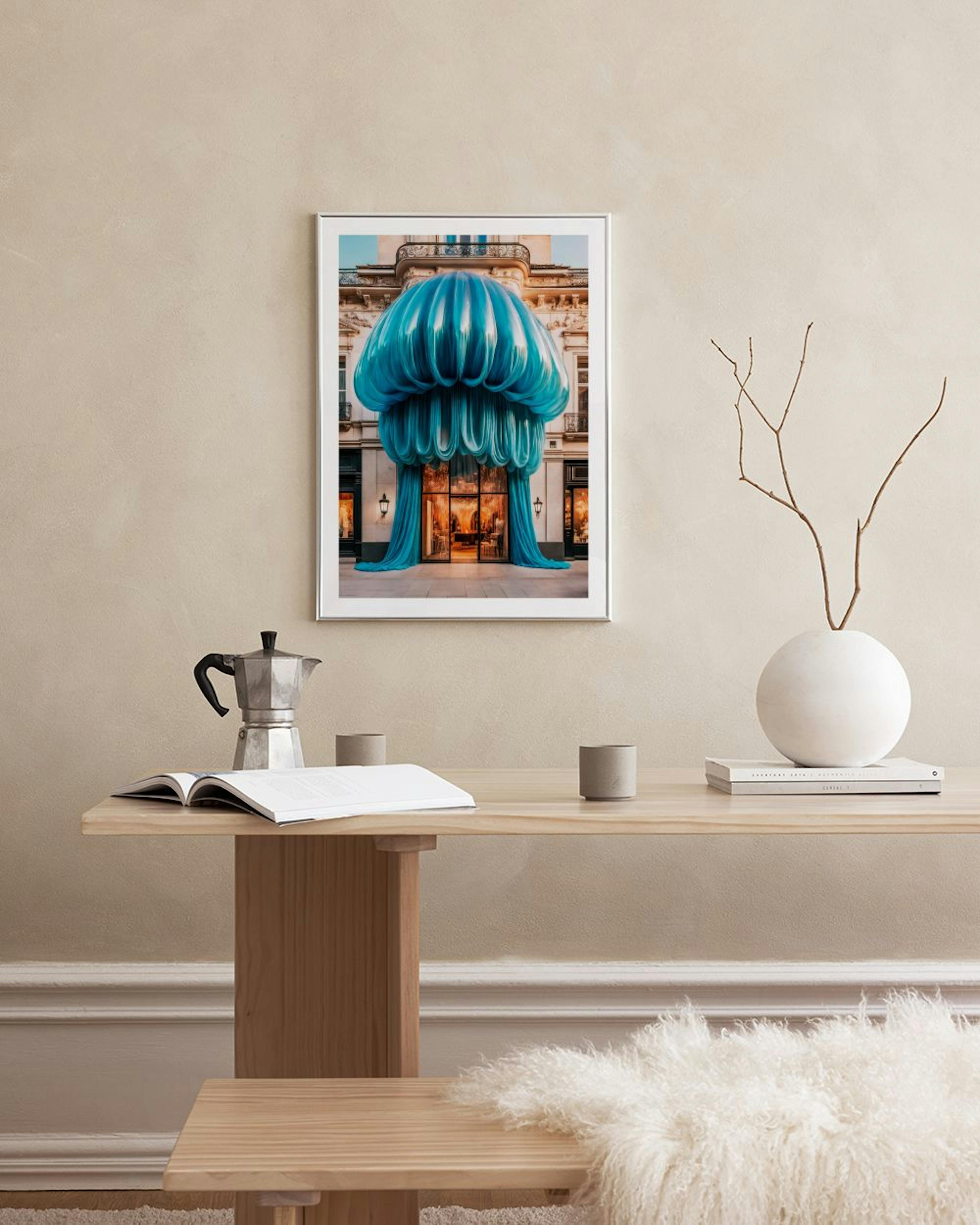AI Art from The Imagine Collection: a glossy teal addition to a classical building creates a surreal and futuristic look.