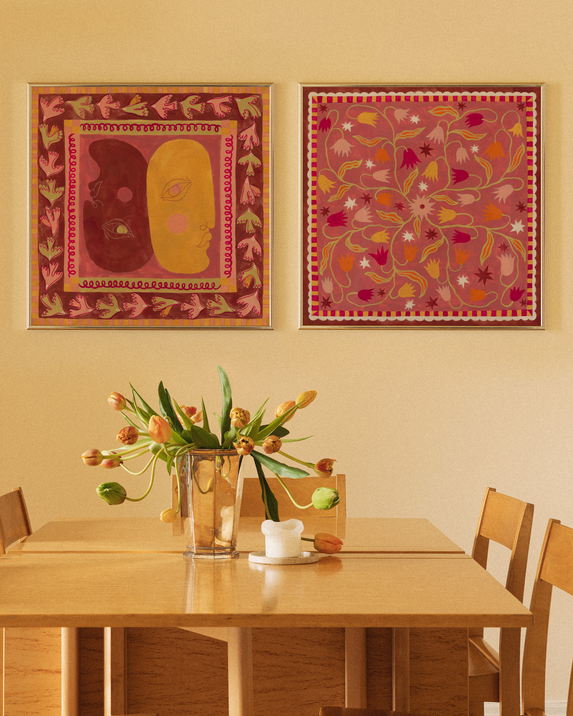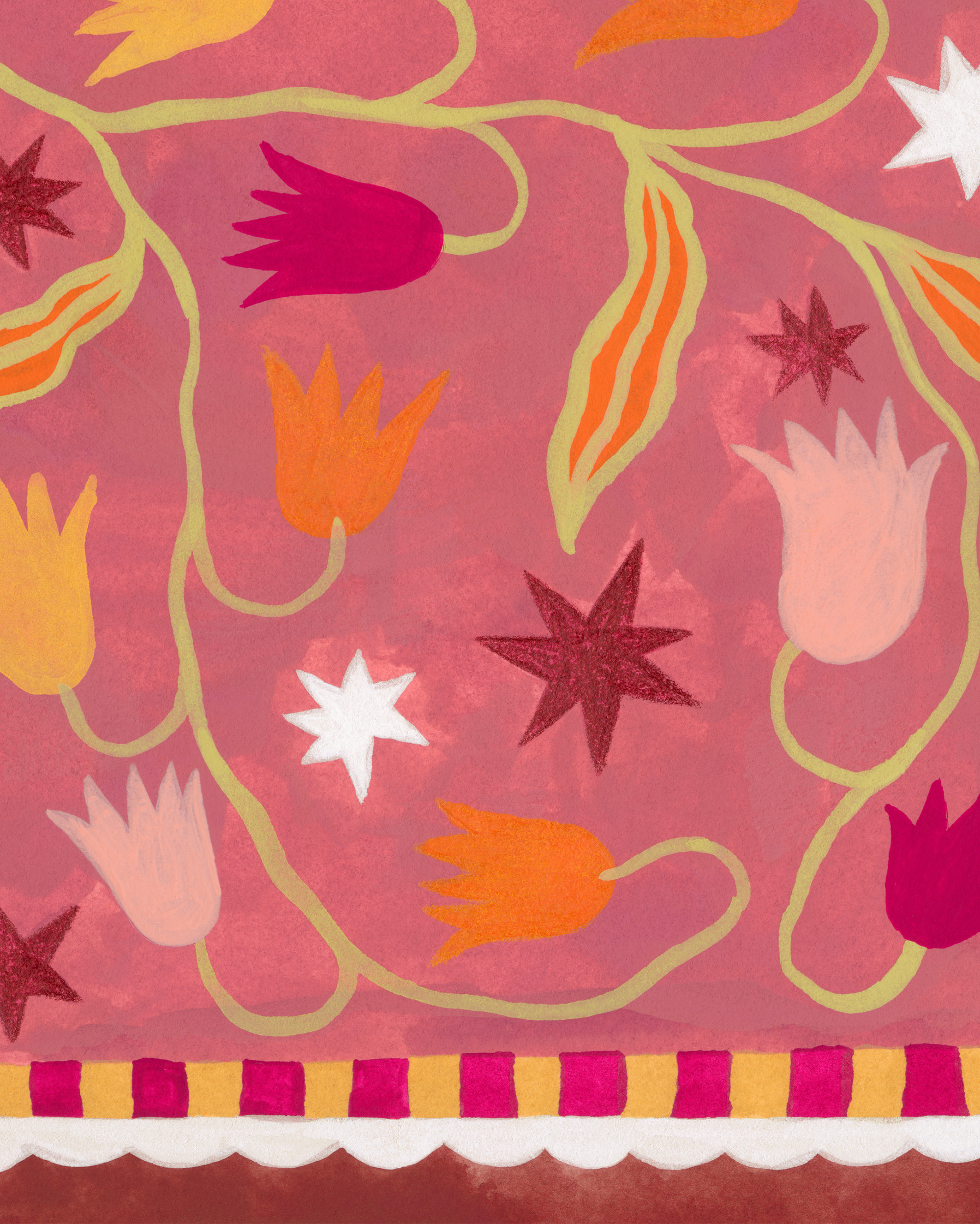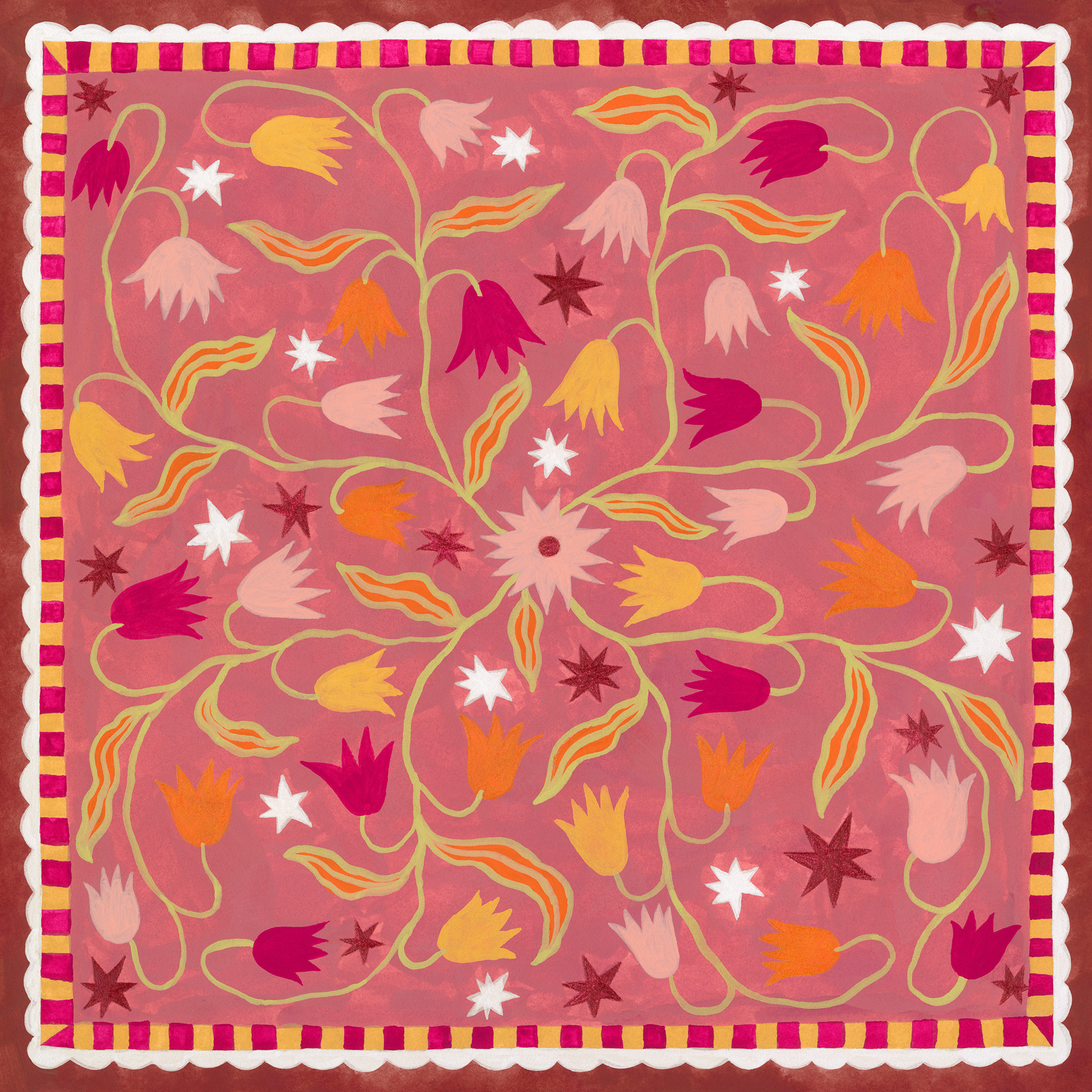 A print with a beautiful floral pattern featuring purple, orange, yellow, and white flowers with green and orange leaves on a pink background.