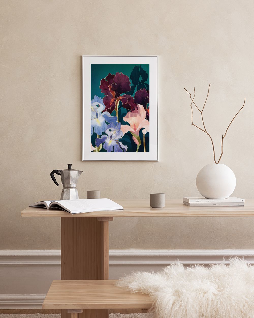 Illustration of abstract iris flowers in dark purple, pink and blue outlined in gold (not gold foil), against a green-blue background. Bringing in some color into your home will add a fun flair!