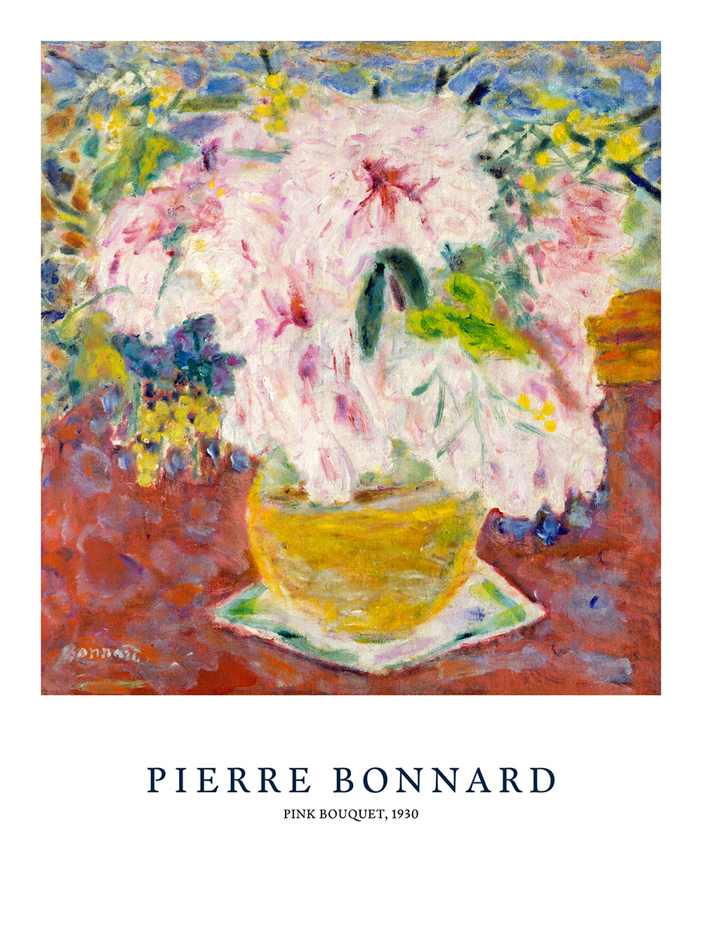 Stunning print of Pierre Bonnard's painting "Pink Bouquet, 1930" illustraiting a bouquet of pink flowers in a yellow pot against a vibrant, multi-coloured background.