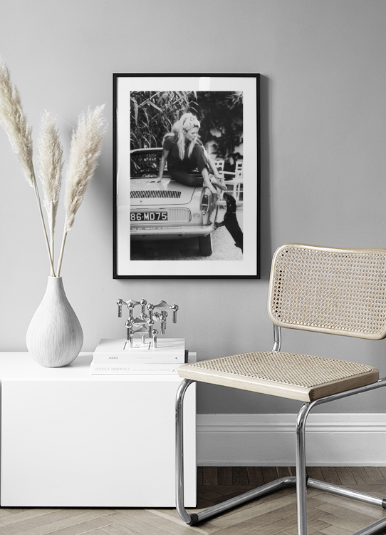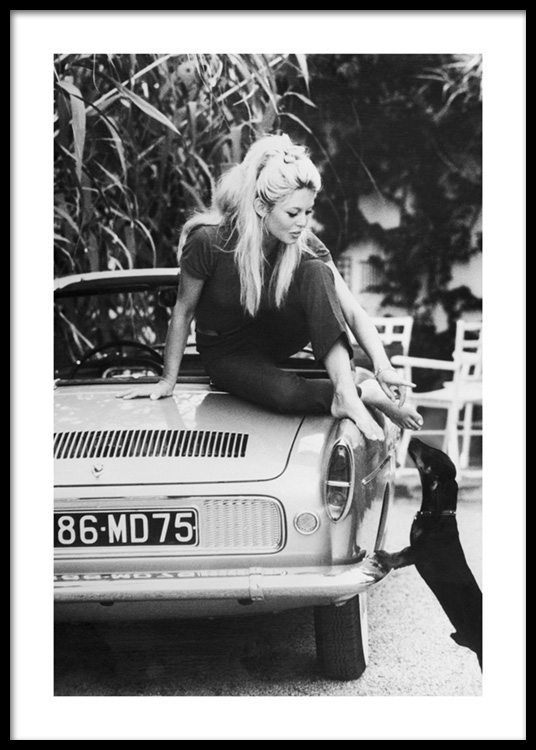 Handpicked design Photograph in black and white of Brigitte Bardot sitting on a car, stretching down towards a dog. Brigitte Bardot was one of the greatest icons of her time, and she made a huge mark.