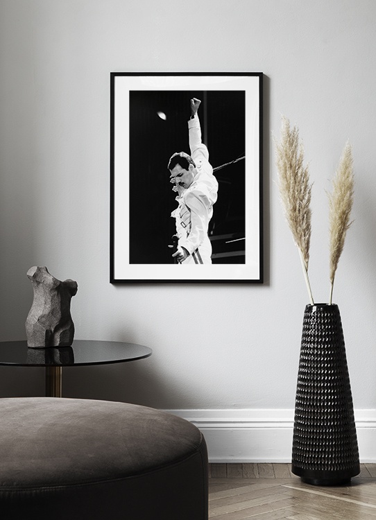 Handpicked design Iconic photograph in black and white of Freddie Mercury from Queen, dressed in white while holding his hand in the air. If you have a favorite icon you might just find it amongst our Iconic photos!