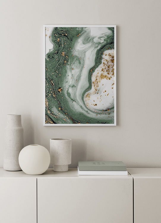 From $17.97Abstract art print with a swirl pattern in green, white and gold. Let loose, bring out your creative side and step out of your comfort zone for a while! Abstract art will never go out of style, and this print is no exception.