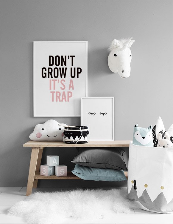 Handpicked design A fun poster with the text, ‘Don't grow up, it's a trap’, in black and pink. A text that we will all relate to. Perfect for the kids room!