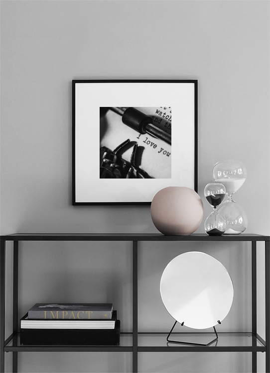 Handpicked design Black and white photo art with an old-fashioned typewriter design. On the paper in the printer it says "I love you" in English. A black and white square design that goes equally well in the living room or the bedroom.