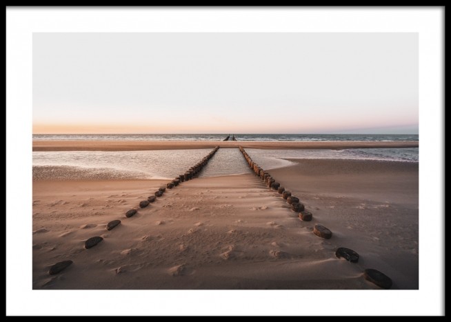 Handpicked design Photograph of a beach in the sunset, with wood poles in the sand leading into the ocean. Ease into your everyday life with peaceful and calming nature prints! Let these beautiful designs take place in your home to create a calm living space.