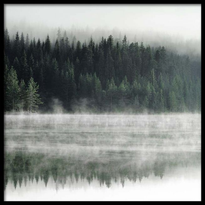Handpicked design Nature photo of a lake and forest with mist gliding across the water. The poster is available in a square format, and looks great paired with other square prints on a dynamic and high-contrast gallery wall. Discover more of our square posters in our 19.7x19.7'' (50x50cm) size category.