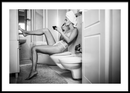 Handpicked design Photograph in black and white of a woman wearing a bra, eating pasta in the kitchen. Your kitchen will become a much more fun space to hang out in with some kitchen prints! The black and white style gives a retro feel.