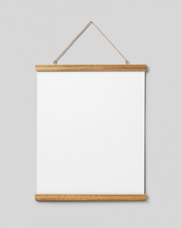 Handpicked design Oak poster hanger with magnet fastening. This poster hanger has a smart magnetic design, which holds the poster firmly without damaging it. Fitting for portrait format posters in 40x50 and landscape format posters in 30x40.