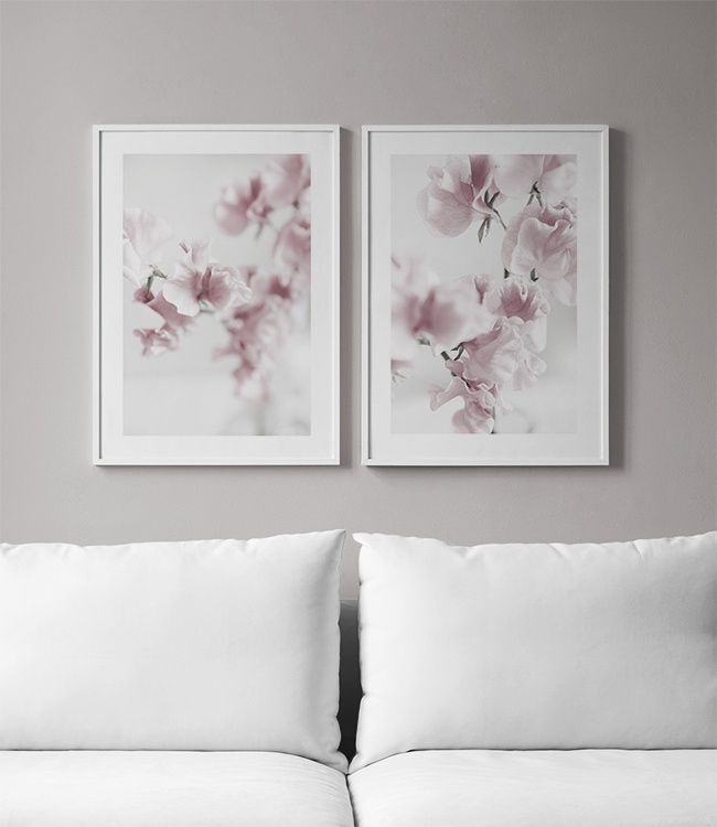 Handpicked design Stylish photo print of pink flowers. This botanical photo poster is the perfect decoration in a modern home. The floral design in pink can be nicely combined with other posters and prints in our Botanical section. The poster has a white border which elegantly frames the design.