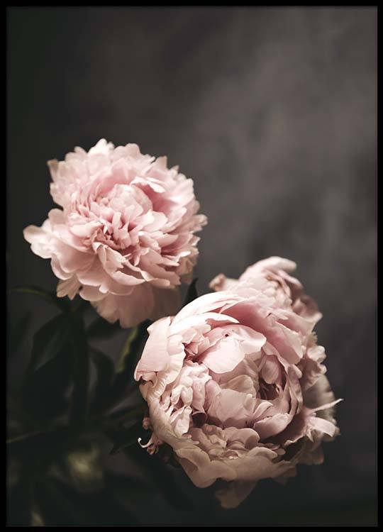 Handpicked design Photograph of two big, pink peonies against a dark grey background. Botanical prints and posters are a great addition for the home where you want to create a warm and welcoming space. Bringing in some botanical influences will spark new life and add a mindful feel, and the pink hues creates a soft impression.