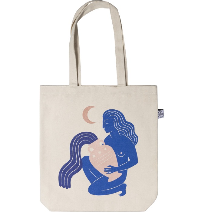 Handpicked design Tote bag in natural beige with a woman painted in blue, pouring water from a vase with a half moon above her. Make your shopping more fun with a colourful tote bag! The tote bags in our limited edition collection are printed in Sweden and made of 100% recycled cotton.